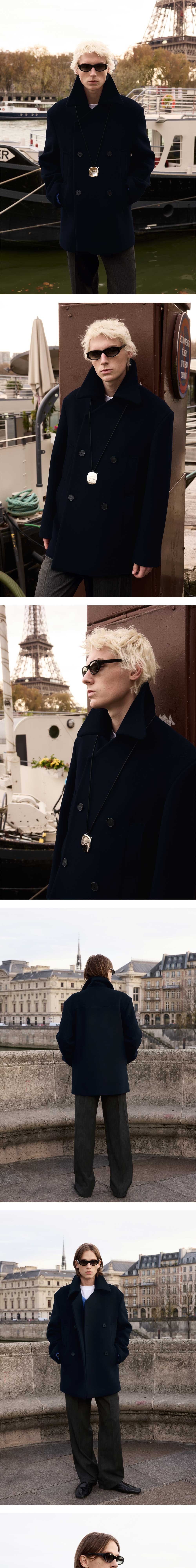 - 루즈 핏 - 피코트 실루엣 - 앞판 히든 스냅 디테일 - 더블 사이드 포켓 디테일 - 로고 각인 소뿔 단추 - 스트라이프 패턴 안감