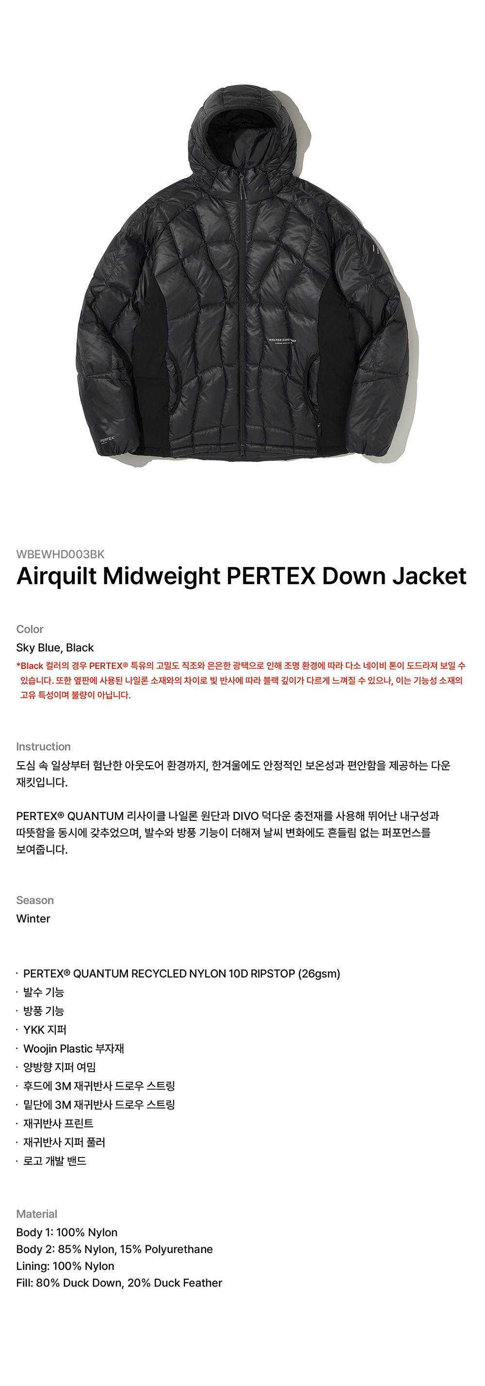 웰터 익스페리먼트 에어퀼트 미드웨이트 퍼텍스 다운 자켓 블랙