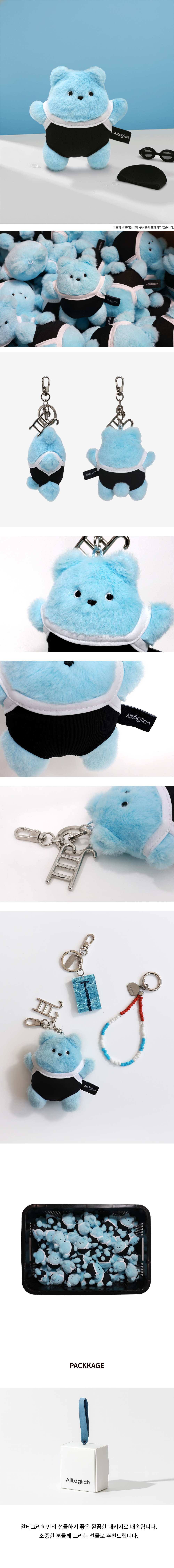 SWIMMY BEAR KEYRING은 수영의 매력 을 가득 담은 귀여운 수영 곰 키링입니다. 수영을 너무 좋아한 나머지, 결국 물빛으로 물들어버린 스위미 베어! 오늘도 수영장으로 향하는 수친자를 닮은 키링입니다. 수영장을 연상시키는 청량한 블루 컬러와 귀여운 수영 복차림으로, 수영의 즐거움을 그대로 담아냈습니다. 수영 가방이나 차 키에 포인트로 더해보세요. 언제 어디서나 수영의 감성을 함께하며, 일상에 작은 활력을 더해줄 키링입니다.