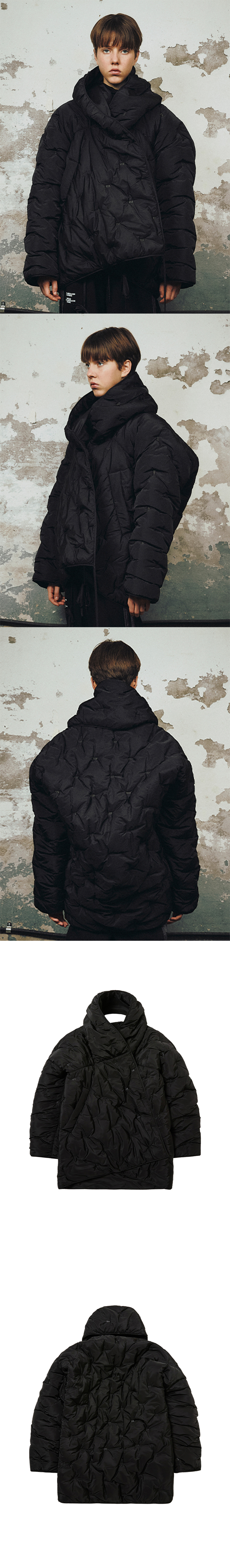 DETAIL - Quilted Jacket (Padded Fleece) - 6 dots High frequency Quilted fabric - Asymmetrical construction - 2 welt pockets - Snap button closure - Integrated scarf-style hoodie COMPOSITION Polyester 100% SIZE MEASUREMENT - Size OS : Length 84cm_ Chest 61cm_ Raglan 87cm Made in S o u t h Korea WASHING INSTRUCTIONS Dry clean recommended Hand wash cold Wash separately Do not bleach