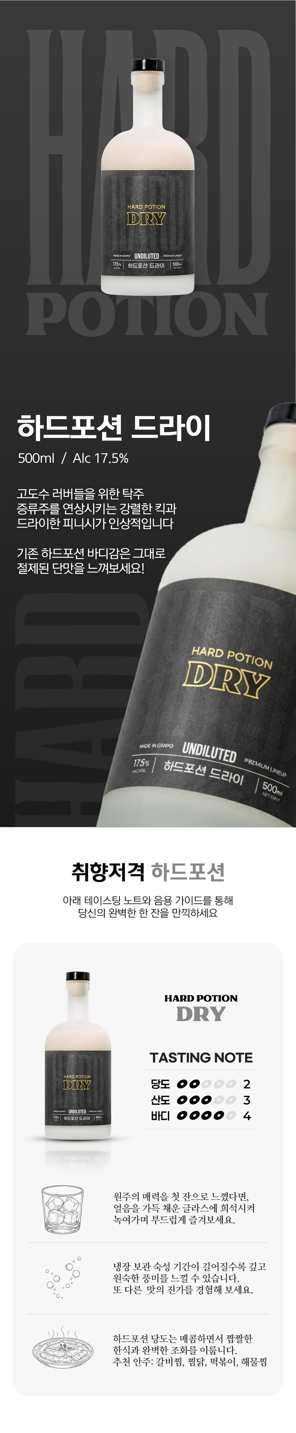 *12:00pm 이전 주문 시 당일출고 다음날 도착* 자연 발효로 얻을 수 있는 최대치인 17.5%를 구현한 압도적인 드라이 스타일의 프리미엄 원액 막걸리입니다. 물보다 쌀의 함량이 높은 농축된 레시피로 감미료 없이도 단단하게 살아나는 밀도감과 질감을 품었으며, 온더락에서 가장 선명하게 드러나는 드라이 피니시가 특징입니다.