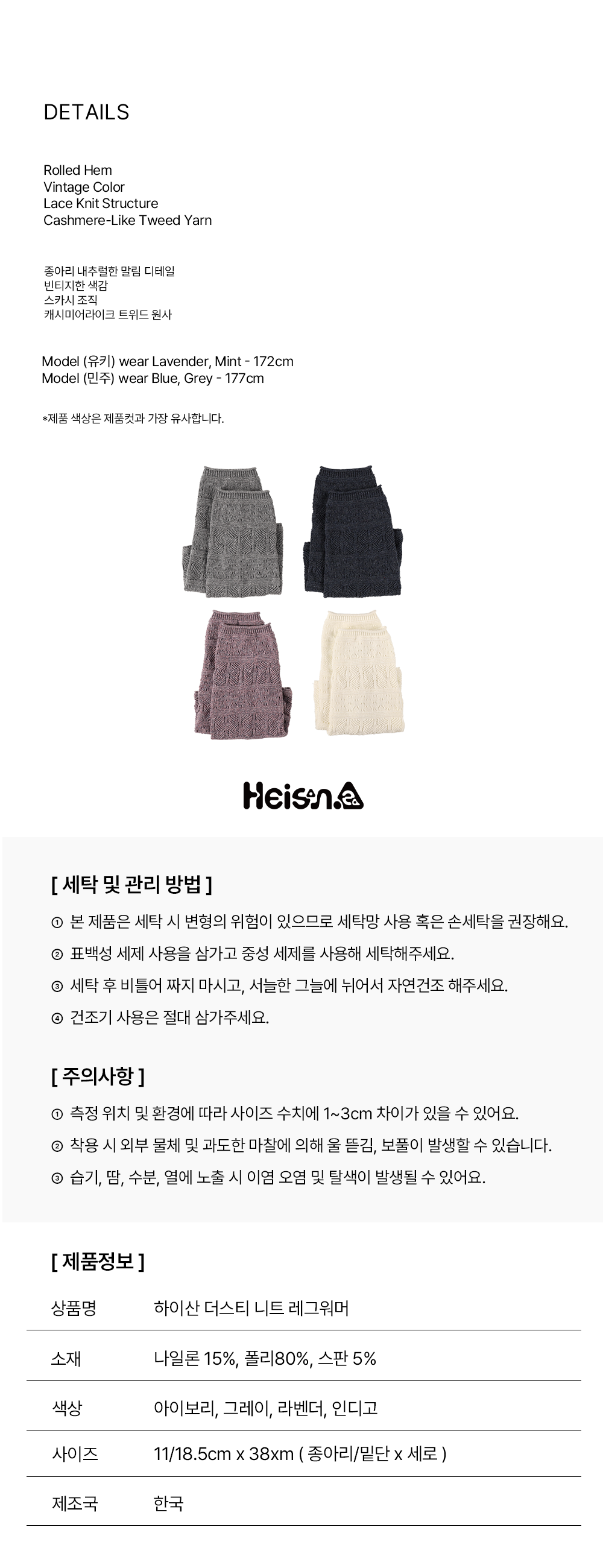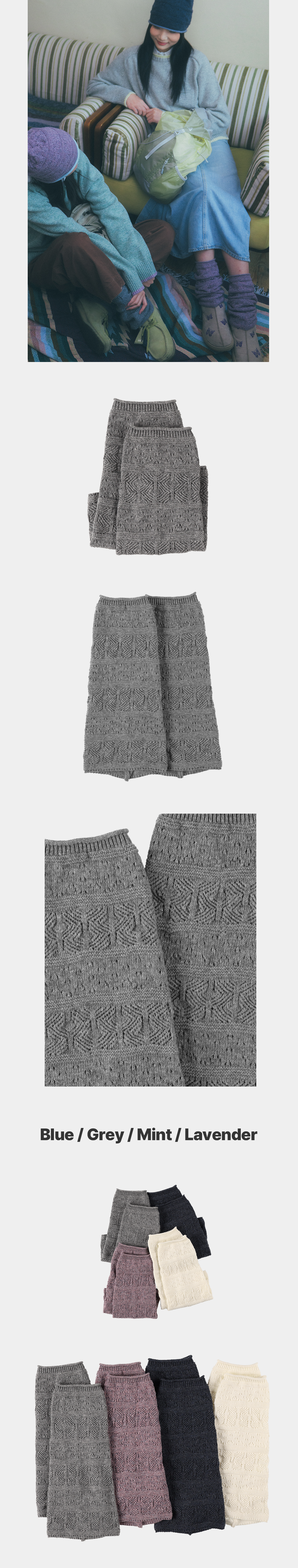 캐시미어와 울의 특징을 모방한 합사 원사를 사용하여 부드럽고 편안한 착용감의 니트 레그워머입니다. 톡톡한 컬러감과 내추럴한 말림 밑단, 스카시 조직으로 빈티지한 무드를 연출해줍니다.