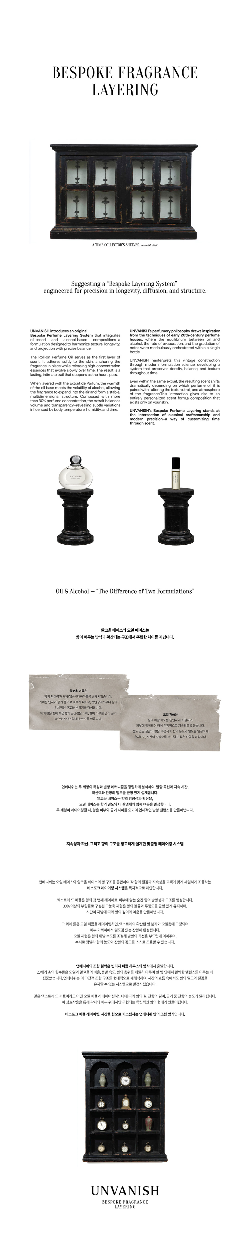 [롱 라스트 바닐라 엑스트레 드 퍼퓸 추천 레이어링] 버진 판타지 크리미한 바닐라 향이 파우더리한 라즈베리와 묵직한 우디 머스크향을 만나 달콤하면서도 관능적인 이미지 알코올 베이스 롱 라스트 바닐라의 럼 향이 다소 강한 느낌을 주지만 곧 파우더리하고도 달달한 향이 사랑스럽고 매력적임 롱 라스트 바닐라의 강한 자극과 부드러움을 잊지 못하도록 버진 판타지의 포근한 여운이 강조된 향 포기 히노키 포레스트 달달한 바닐라 위에 젖은 편백숲 향이 더해져, 따뜻함과 자연스러움이 공존하는 편안한 우디 바닐라 향이 완성됨 강할 수 있는 롱 라스트 바닐라의 첫 향을 오일 베이스 포기 히노키 포레스트의 젖은 흙내음이 부드럽게 정리해주고, 은은한 패츌리가 향의 지속력을 늘려주는 느낌 알코올 베이스 롱 라스트 바닐라와 오일 베이스 포기 히노키 포레스트가 만나, 도시의 따뜻함과 자연의 정적이 어우러지는 깊이 있는 조합