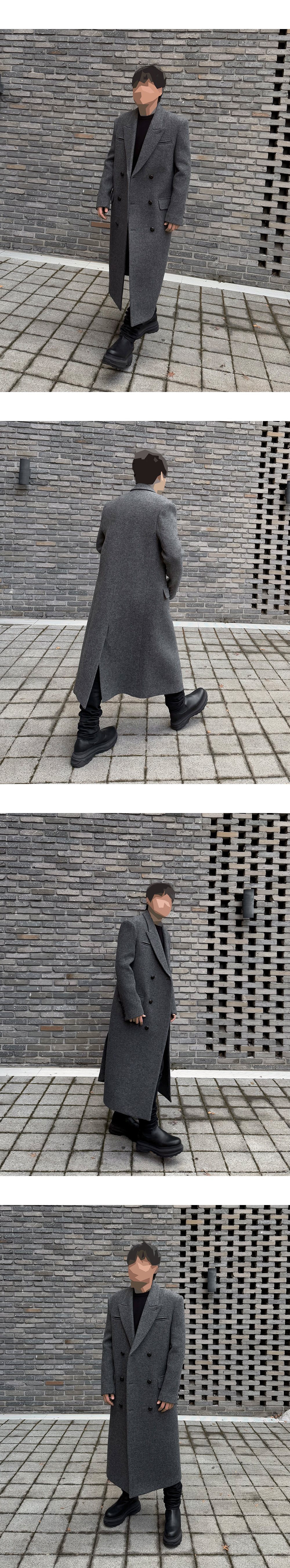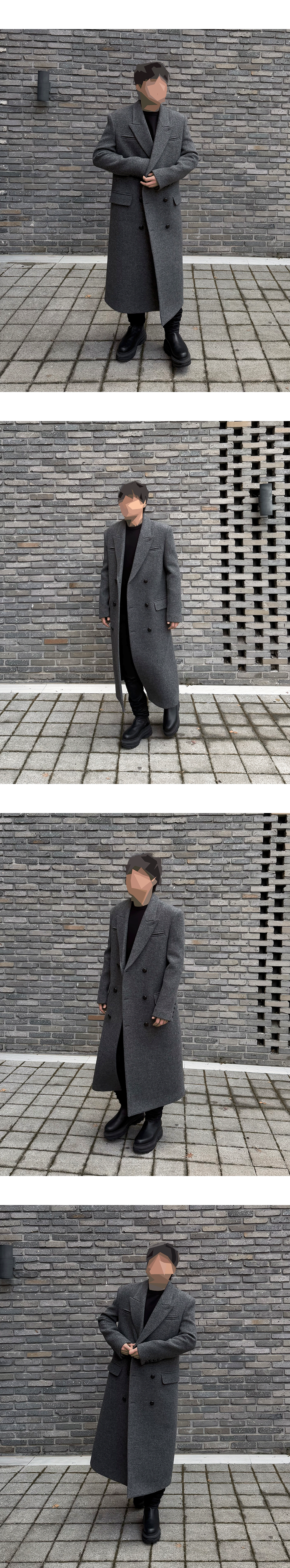 각진 실루엣의 정갈한 슬림 핏 더플 코트 Model spec - 178cm / 70kg Outer : 25FW SLIM FIT TAILORED DOUBLE COAT GRAY - Size 1 Top : Undermycar 25FW INFINITY ORBIT FINE KNIT BLACK/GRAY – Size 1 Pants : Undermycar MU.157 CLASSIC LOGO WAX COATED SLIM STRAIGHT JEANS BLACK - Size 1