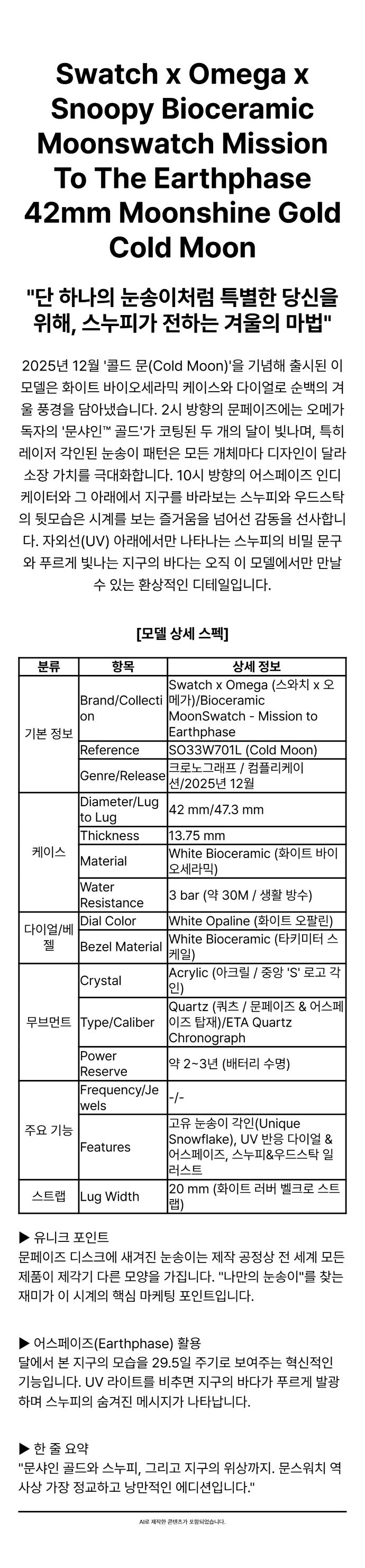 스와치 x 오메가 x 스누피 바이오세라믹 문스와치 미션 투 더 어스페이즈 42mm 문샤인 골드 콜드 문
