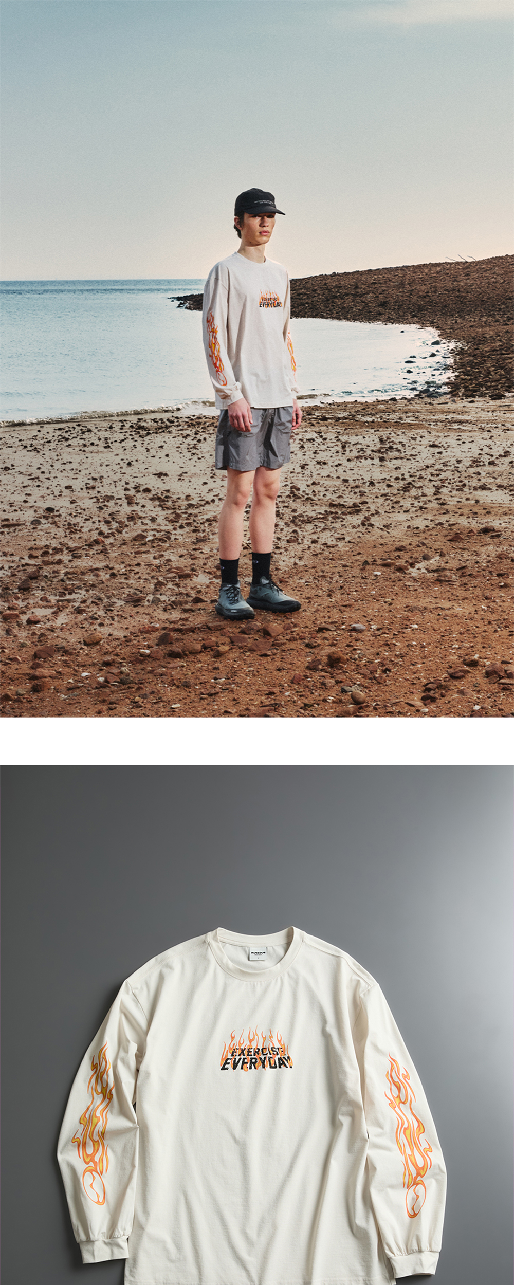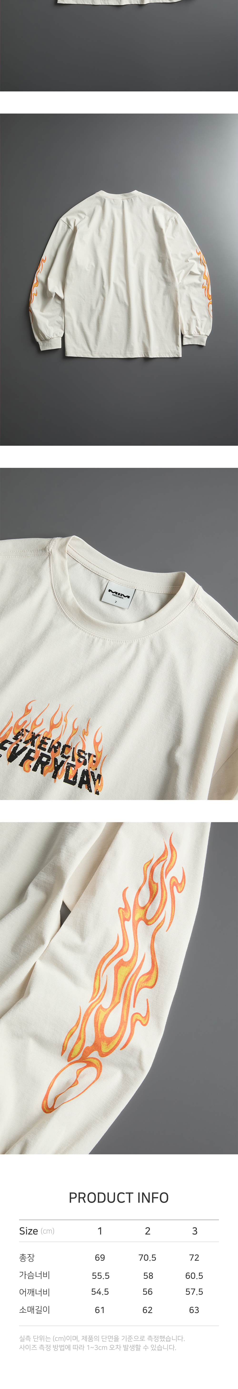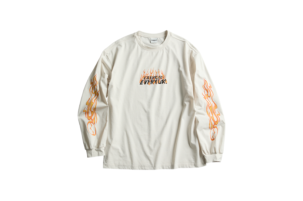 Polyester 100% logo print flame graphic on sleeve relaxed fit 1 : Length 69cm / Chest 55.5cm / Shoulder 54.5cm / Sleeve Length 61cm 2 : Length 70.5cm / Chest 58cm / Shoulder 56cm / Sleeve Length 62cm 3 : Length 72cm / Chest 60.5cm / Shoulder 57.5cm / Sleeve Length 63cm Hand wash recommended Do not bleach Wash dark and light colors separately Avoid long exposure to sunlight Dry flat in shade Use neutral detergent Do not soak in water for a long time