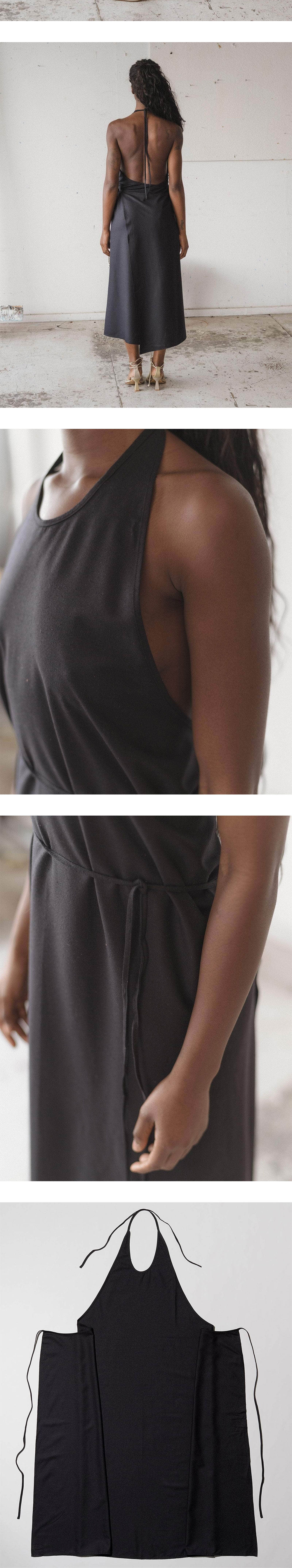 베이스레인지 우먼 에이프런 드레스 블랙입니다. - 와일드 실크 소재의 자연스러운 광택이 돋보이는 랩 드레스 - 홀터넥 디자인과 오픈 백 디테일 - 넥과 허리 스트랩으로 체형에 맞게 핏 조절 가능 - 가볍고 유연한 실크로 자연스러운 드레이프 연출