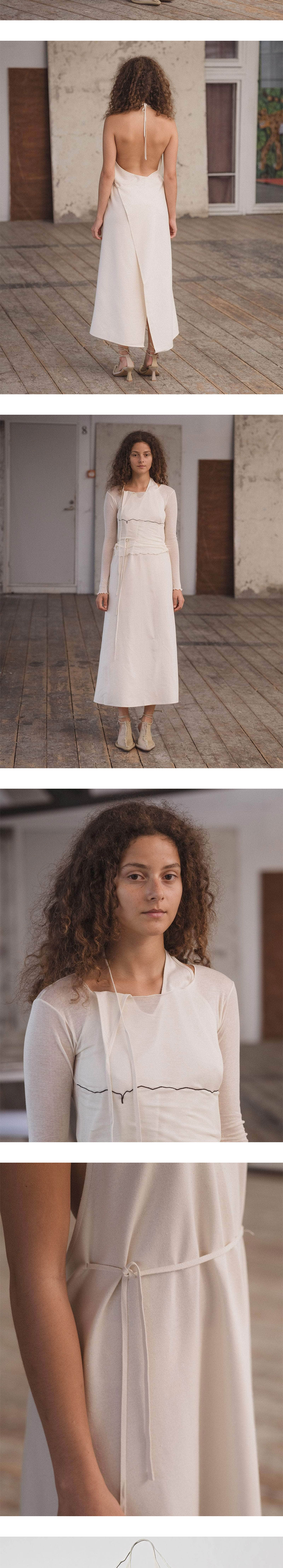 베이스레인지 우먼 에이프런 드레스 오프 화이트입니다. - 와일드 실크 소재의 자연스러운 광택이 돋보이는 랩 드레스 - 홀터넥 디자인과 오픈 백 디테일 - 넥과 허리 스트랩으로 체형에 맞게 핏 조절 가능 - 가볍고 유연한 실크로 자연스러운 드레이프 연출