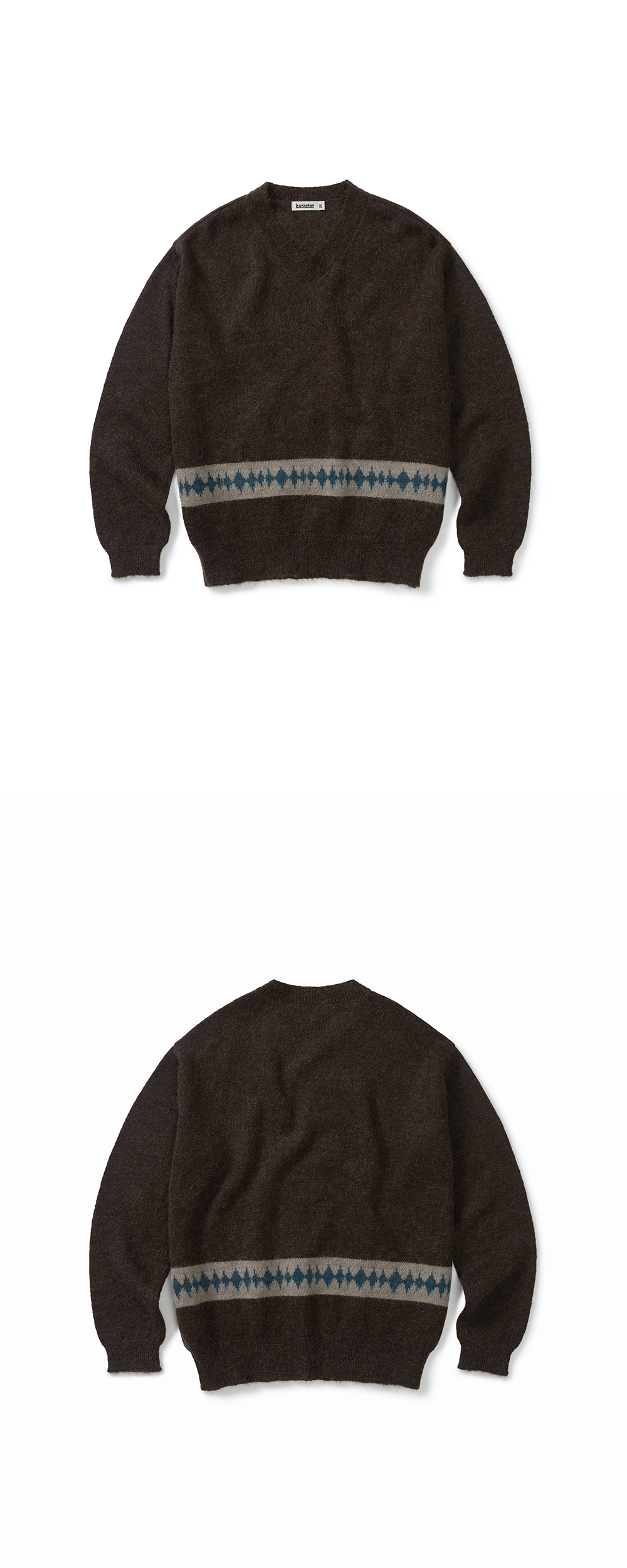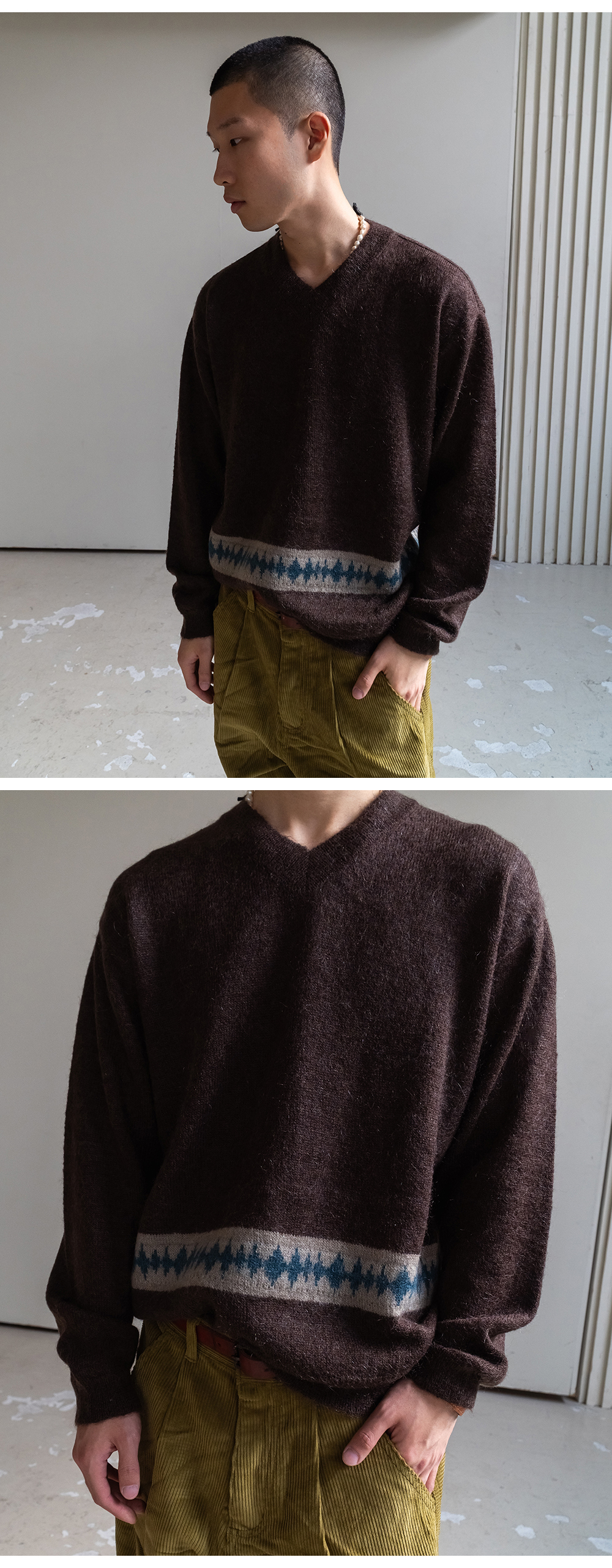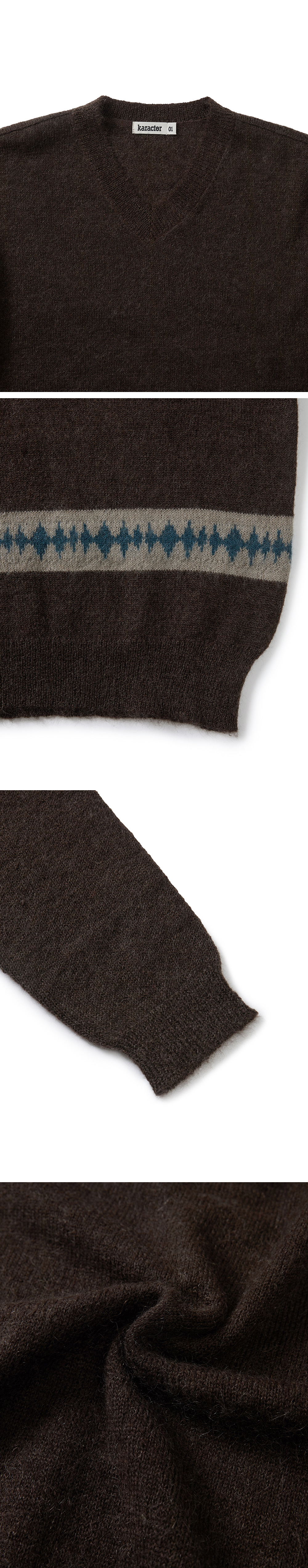 Product Info. - 키드 모헤어와 메리노 울을 블렌딩한 고급 원사로 편직한 브이넥 니트 - 모헤어 소재 특유의 가볍고 포근한 보온력과 자연스럽게 살아나는 헤어리한 텍스처 - 천연 울 혼방 소재 특유의 드라이하고 러프한 표면감 - 경쾌한 크롭 기장과 릴렉스드 핏으로 완성된 편안한 실루엣 - 빈티지 무드의 자가드 패턴 컬러 블럭 포인트 - 단독 착용 혹은 이너 레이어드에도 적합한 활용도 높은 아이템 *MODEL 173cm, wearing size 01