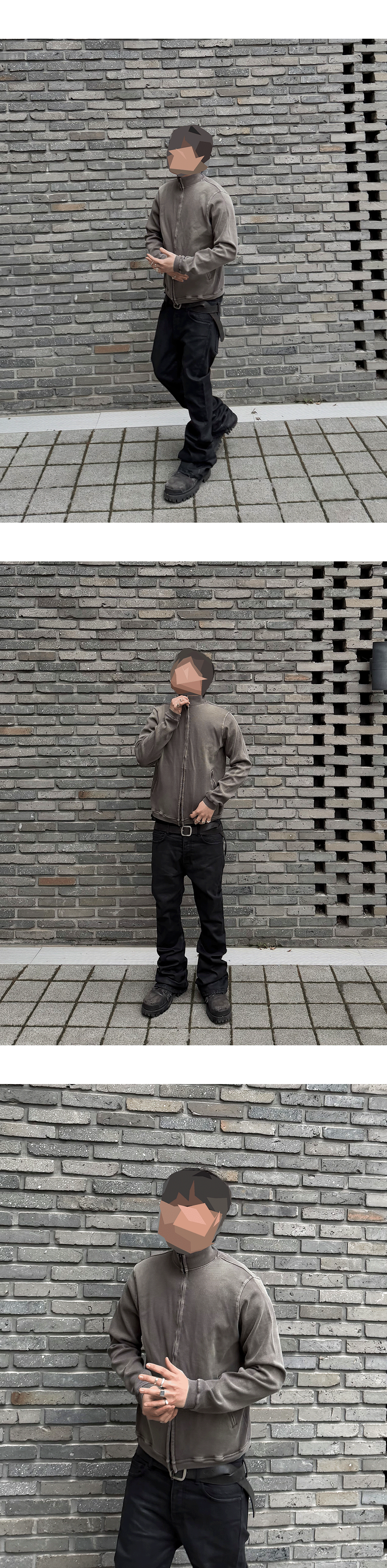 Model spec - 178cm / 70kg 상의 - Mu.156 Classic Logo Brush Washed Ribbed Mock Neck Zip-Up - Size 1 착용 하의 - Mu.158 Classic Logo Wax Coated Flare Jeans Black - Size 1 착용 (12월 29일 출시 예정)