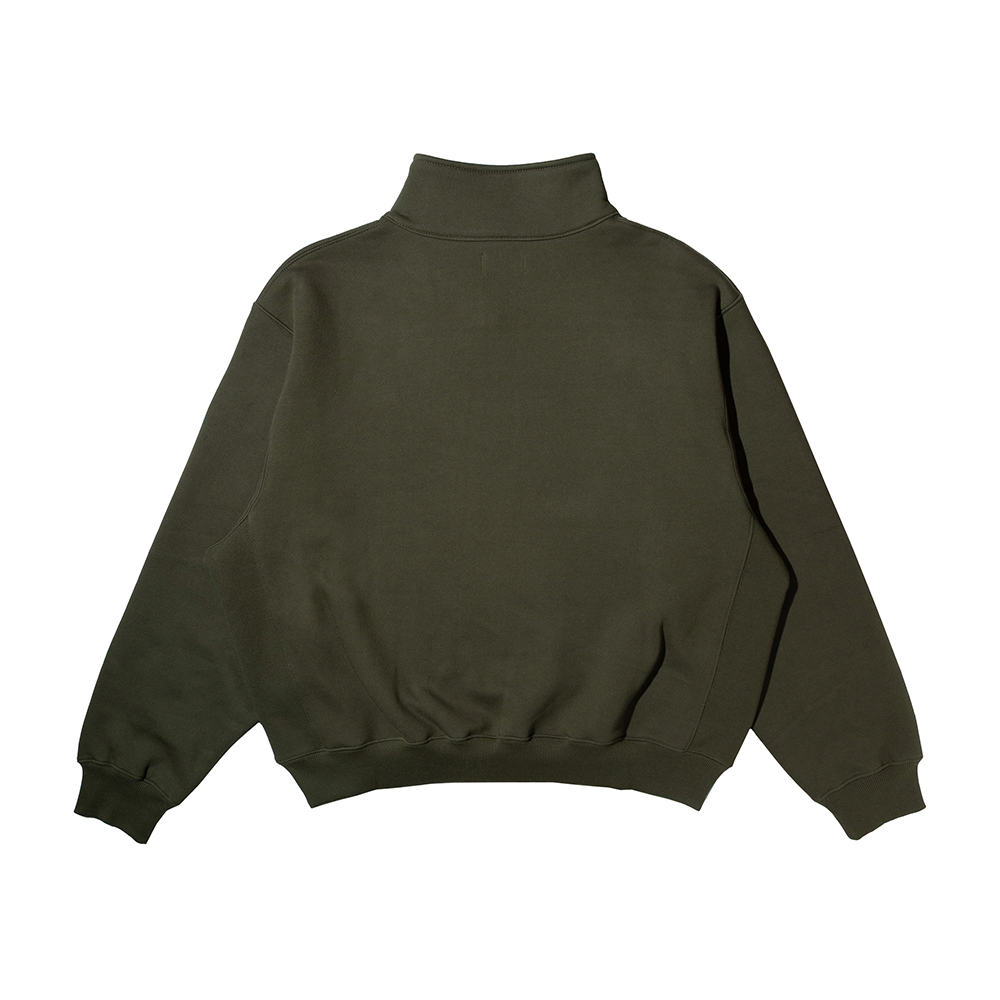 HONEY SCOOP HOUSE SQ LOGO QUARTER ZIP PULLOVER OLIVE 100% COTTON SQ LOGO EMBROIDERED ON FRONT YKK METAL ZIP CLOSURE UNISEX RELAXED FIT