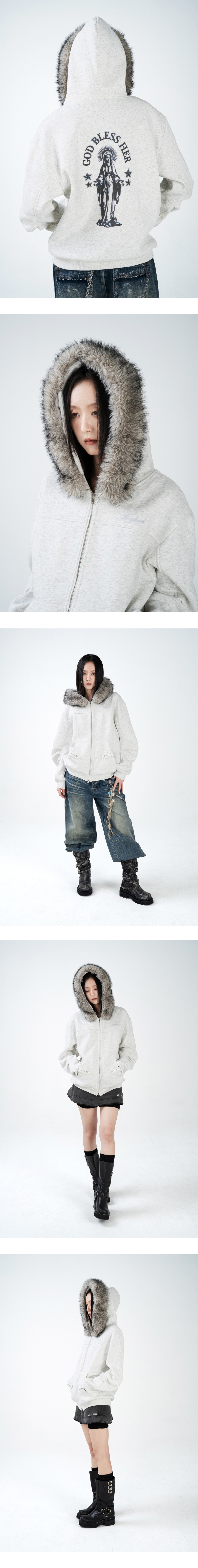 워싱이 강하게 들어가 빈티지한 톤을 연출하며, 와이드한 실루엣으로 편안한 착용감을 제공합니다. 안감은 기모 처리되어 있어 따뜻하며, 뒷면의 포인트 그래픽과 모자 부분의 트리밍이 디자인의 포인트가 됩니다. 퍼 트리밍은 탈부착이 가능하고, 투웨이 지퍼를 사용해 다양한 실루엣으로 연출할 수 있습니다.