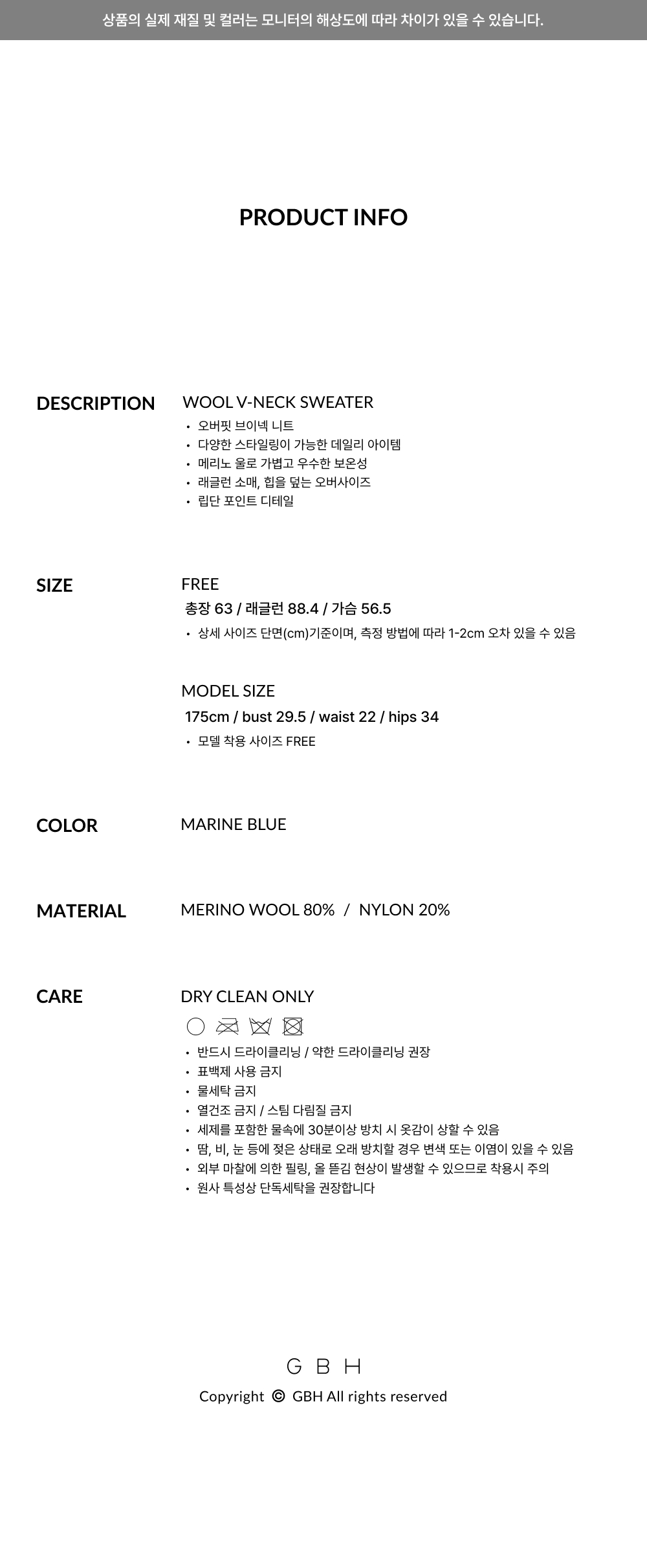 지비에이치 어페럴 울 브이넥 스웨터 / 마린 블루