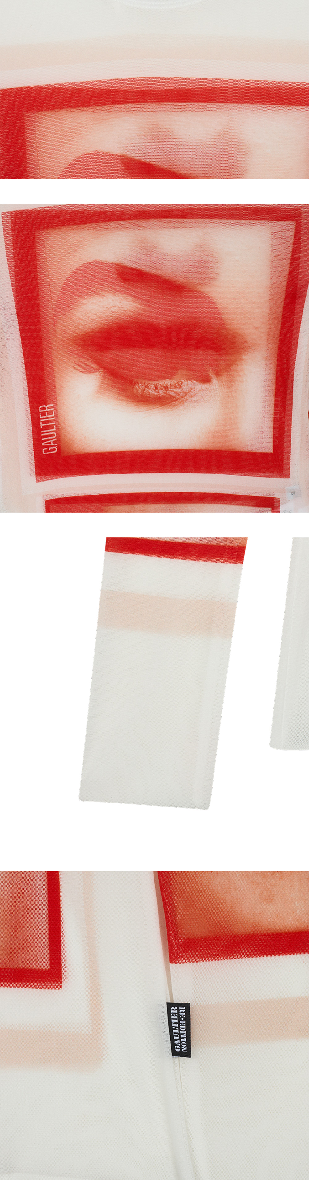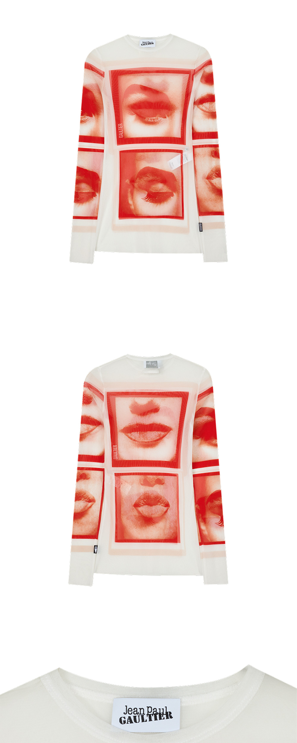 장 폴 고티에 우먼 리-에디션 : 메쉬 롱슬리브 탑 프린티드 "Eyes" 앤 "Lips" 화이트 – 26SS