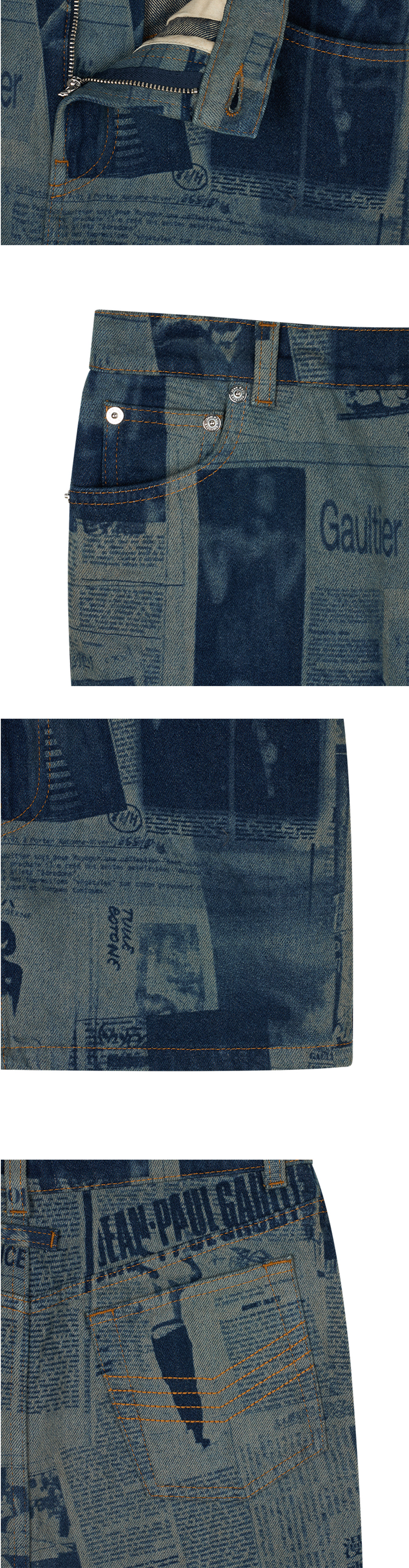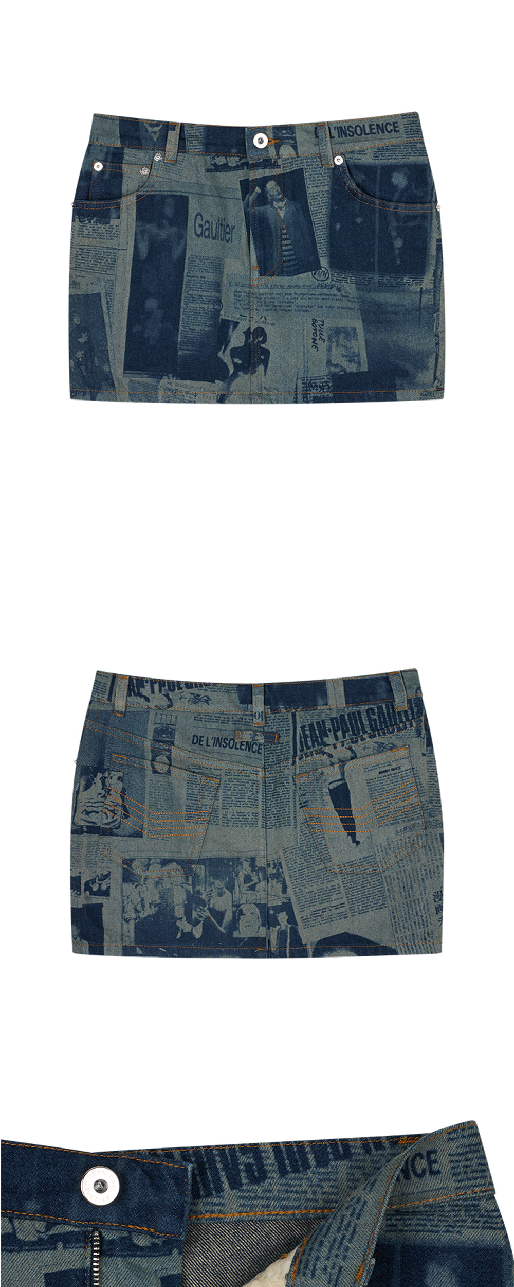 장 폴 고티에 우먼 미니 스커트 위드 뉴스페이퍼 프린트 인디고입니다. - 브랜드의 정체성이 담긴 상징적인 '뉴스페이퍼(Newspaper)' 그래픽 프린트 - 데님 소재 위에 아카이브 기사와 사진들을 정교하게 배치한 유니크한 디자인 - 미니멀한 실루엣과 빈티지한 인디고 컬러가 조화를 이루는 미니 스커트