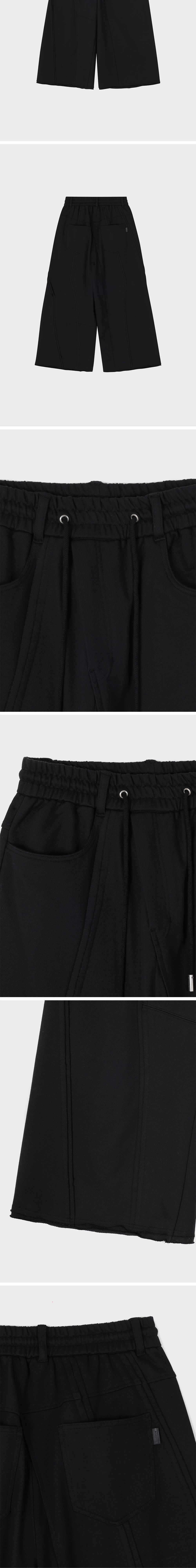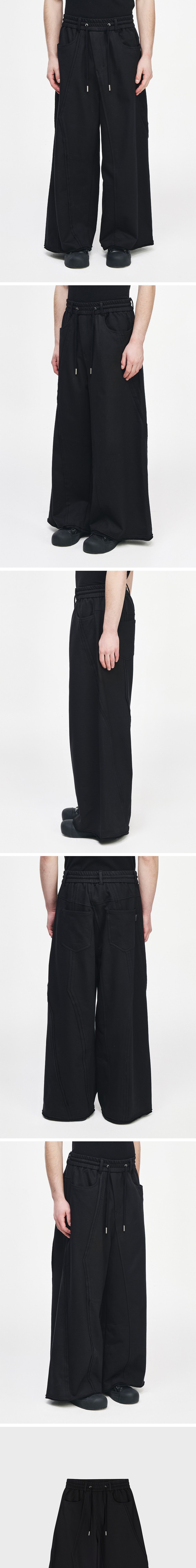 SONGZIO 컬렉션 바이어스캐스트 트레이닝 팬츠 실켓 가공된 코튼 패브릭 입체적인 어시메트릭 컷아웃 디자인 레이어드 컷아웃 디테일 SONGZIO 시그니처 레더라벨 포인트 와이드 실루엣 FABRICATION MADE IN CHINA
