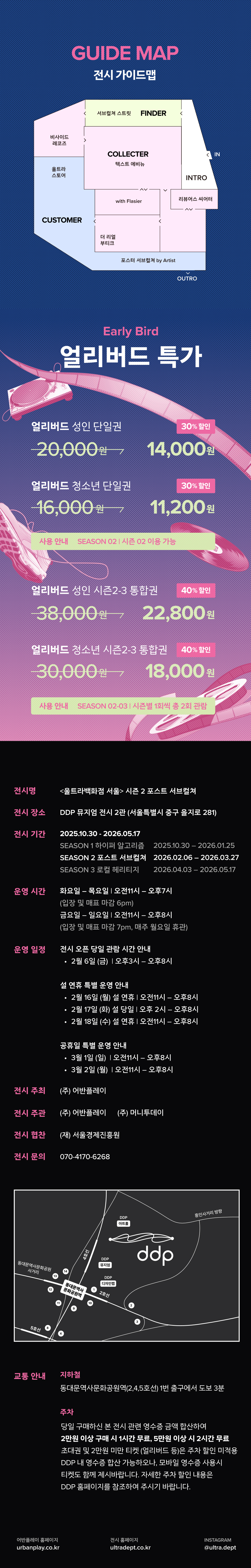 [전시 오픈 당일 관람 시간 안내] 2월 6일 (금) 오후 3시 - 8시 [설 연휴 특별 운영 안내] 2월 16일 (월) 설 연휴 : 오전 11시 - 오후 8시 2월 17일 (화) 설 당일 : 오후 2시 - 오후 8시 2월 18일 (수) 설 연휴 : 오후 11시 - 오후 8시