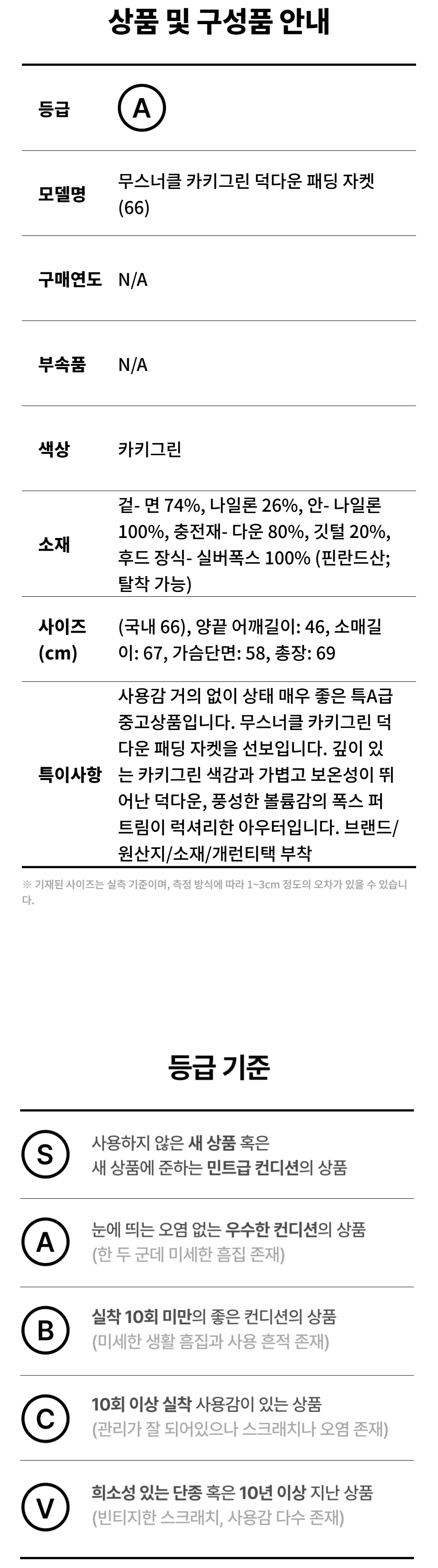무스너클 카키그린 덕다운 패딩 자켓