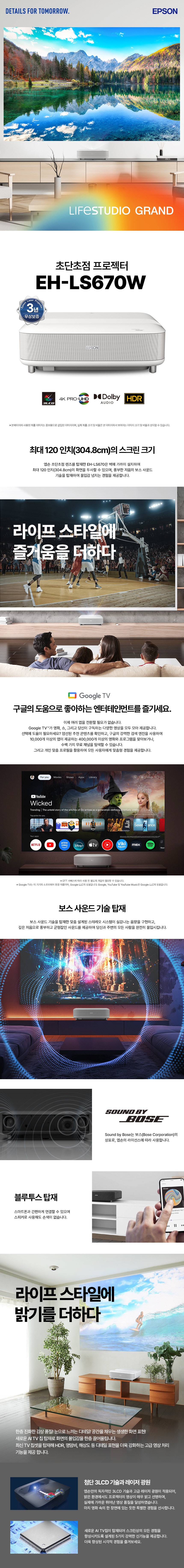 엡손 라이프스튜디오 GRAND EH-LS670W 프로젝터 4K 3600 ISO루멘 BOSE 구글TV