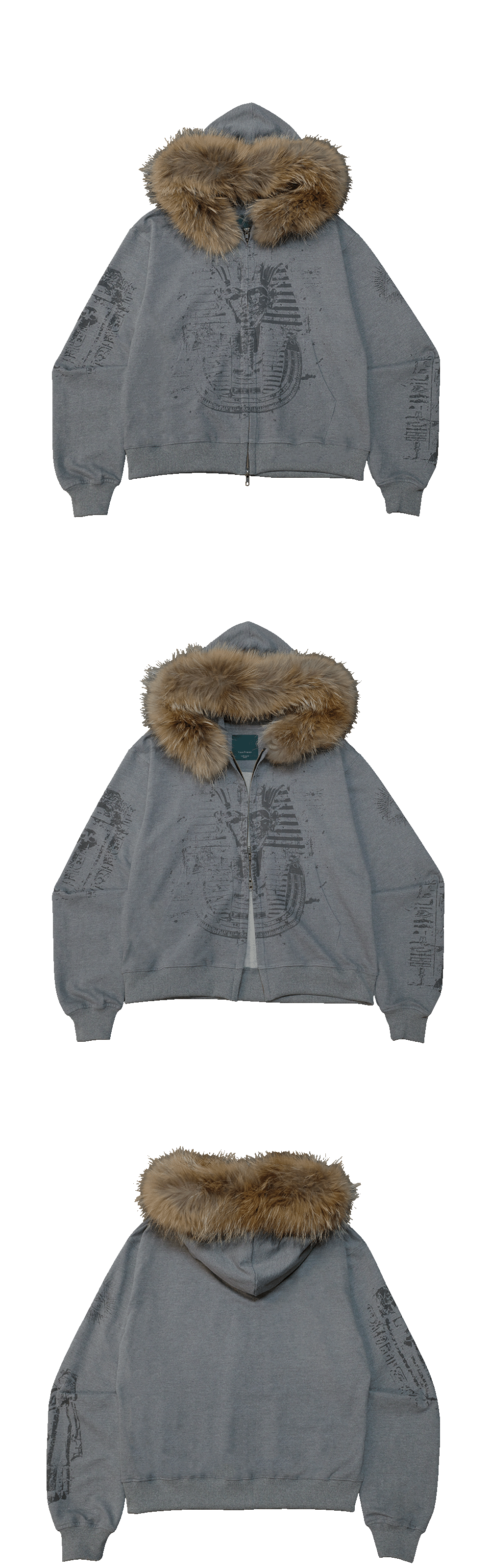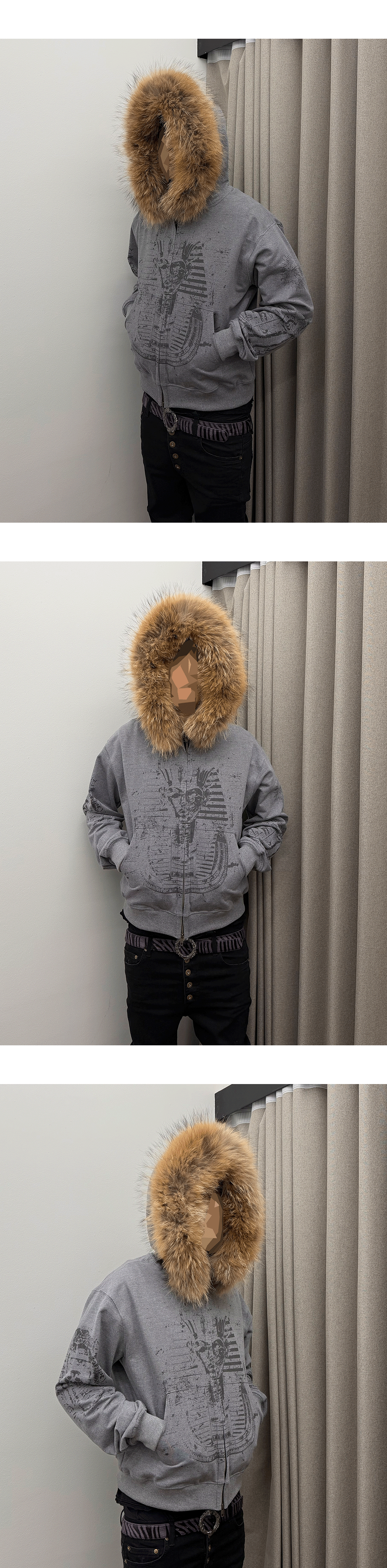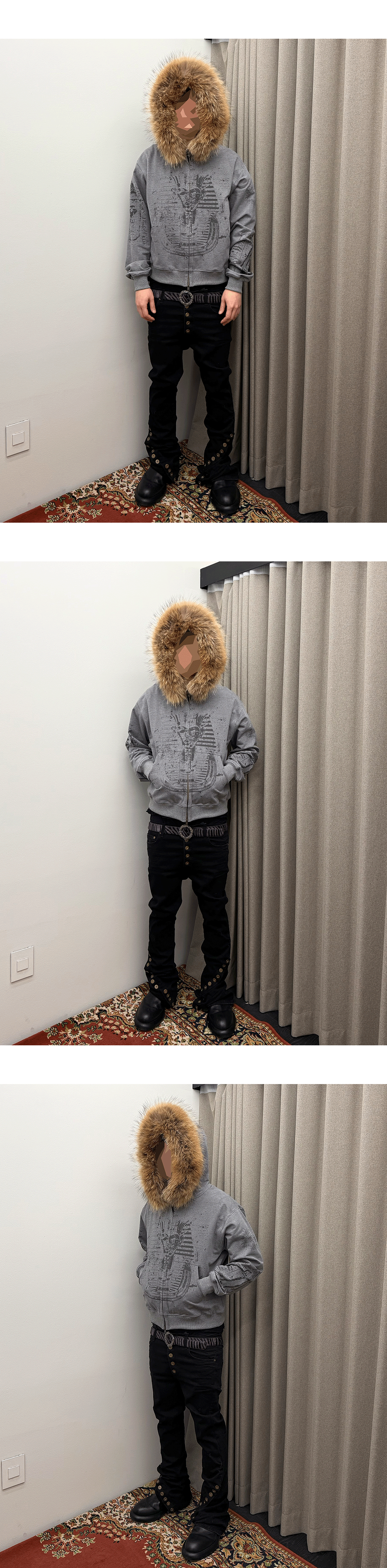 전면에 스핑크스 아트웍을 적용하고, 풍성한 라쿤 퍼 후드를 더해 강렬한 무드와 존재감을 동시에 살린 후드 집업입니다. Model spec - 178cm / 70kg - Size 2 착용