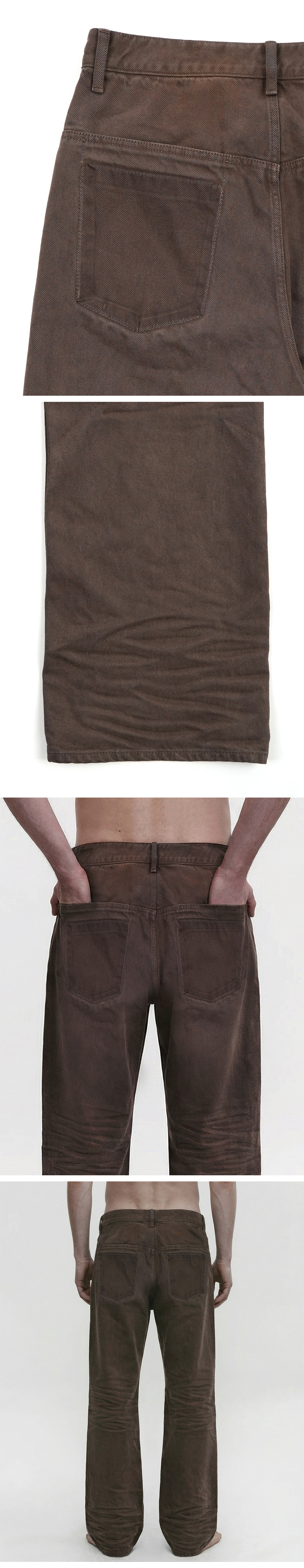 브라운 컬러 특유의 깊이 있는 톤과 자연스러운 워싱감이 돋보이는 팬츠입니다. 여러 차례 가공을 통해 완성된 미묘한 색 변화와 주름 표현은 착용 초기부터 오래 입은 듯한 분위기를 연출해줍니다. 허벅지부터 밑단까지 스트레이트에 가까운 실루엣으로 과하지 않게 떨어지며, 움직임에 따라 자연스럽게 생기는 주름이 스타일의 완성도를 높입니다. 탄탄한 코튼 원단을 사용해 내구성이 뛰어나고, 반복 착용에도 형태 안정감을 유지합니다. 클래식한 5포켓 디테일과 미니멀한 구성으로 어떤 상의와도 쉽게 매치할 수 있으며, 니트, 가죽 자켓, 아우터 등 다양한 스타일에 자연스럽게 어우러집니다.