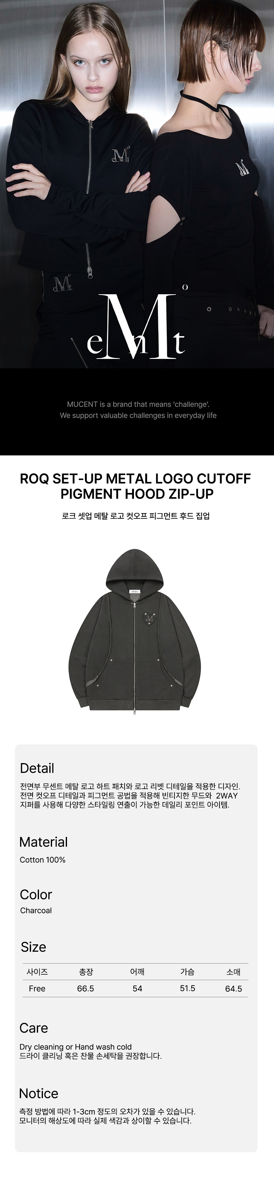 무센트 로크 셋업 메탈 로고 컷오프 피그먼트 후드 집업 남녀공용 차콜