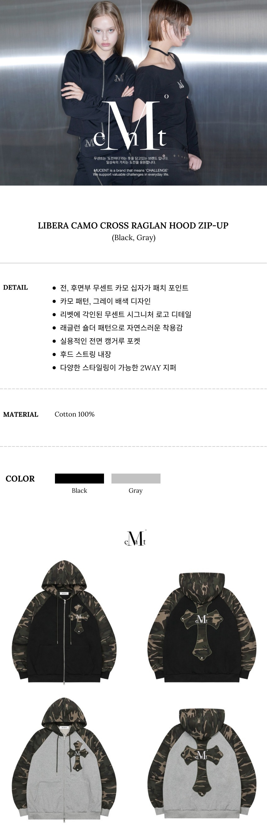 무센트 리베라 카모 크로스 배색 나그랑 후드 집업 남녀공용 (2컬러) 그레이