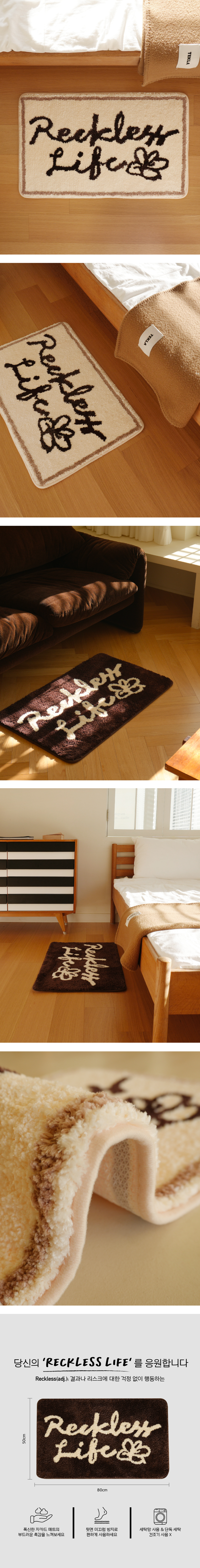 [러그] Reckless Life 너무 많은 고민이나 생각으로 힘들게 살고 있는 나 자신을 위한 러그입니다 Reckless(adj.): 결과나 리스크에 대한 걱정 없이 행동하는 - 생각은 잠시 내려놓고, 무심한 하루를 즐기세요. 현대인의 복잡한 삶 속에서, 잠시 두려움과 고민을 내려놓고 쉬고 싶은 순간이 필요합니다. "Reckless Life" 러그는 그런 순간을 상징합니다. Check - 다양한 공간에 어울리는 모던한 타이포그래피 러그 입니다. -폭신한 자카드 매트로 발에 닿았을때 부드러운 촉감을 느껴보세요 -뒷면 미끄럼 방지로 밀리지 않아, 편하게 사용하실 수 있습니다. - 러그 테두리가 오버로크로 마감되어 제품의 형태가 흐트러지지 않고 깔끔합니다. Size : 80 x 50cm 세척방법 - 세탁기 사용 시 세탁망 사용 & 단독 세탁 - 건조기 사용 X 구매 전 체크 사항 제품의 실의 잡사가 끼어 있을 수 있습니다. 전체적인 실의 높낮이는 조금씩 다를 수 있습니다.