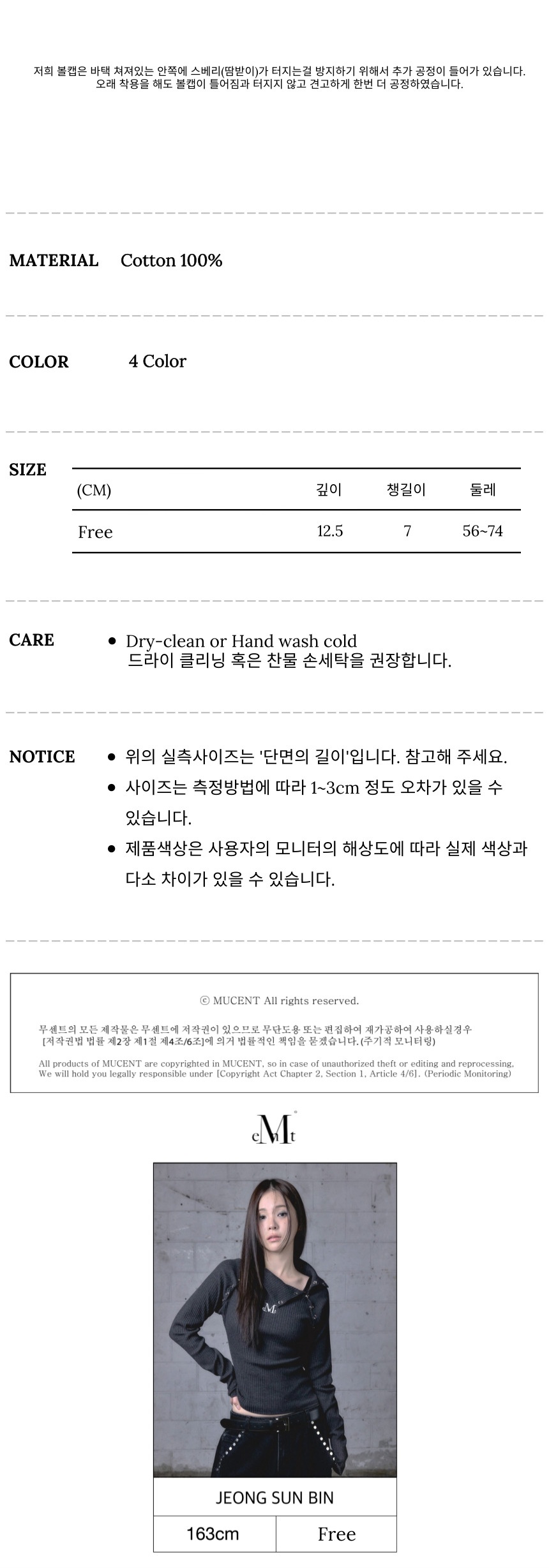 ┃Detail 볼캡에 로고를 넣을 때 무센트의 지향성과 세리프체와 잘 어울려서 폰트를 세 리프체로 채택했습니다. 세리프는 로마글 활자의 기둥의 양 끝을 맺는 돌출된 형태로 과거 로마 황제의 기념비에 새겨진 글자 모양을 다듬어 만든 고전적인 글자꼴에 기본을 두고 있습니다. 이 볼캡은 남녀공용으로 모두 착용할 수 있게 제작하려 했기 때문에 적당 한 깊이여야 했습니다. 우리의 볼캡은 깊이감이 깊습니다. 푹 들어가는 깊이 감 덕분에 눌러썼을 때의 모자 핏감, 그리고 적당히 긴 챙으로 얼굴이 작아보 이는 모자 핏이 무센트 볼캡만의 특징입니다. 무센트 볼캡은 얼굴이 작아보이는 효과를 주게끔 디자인된 '소두 볼캡'이며, 모자 뒷부분 조이개를 최대로 풀었을시 머리가 큰 남성분에게도, 조이개를 초 대 조였을시 머리가 작은 여성분들 모두 착용 가능한 남녀공용 볼캡입니다. ┃Material : Cotton 100% ┃Care : Dry Cleaning ┃Made in China