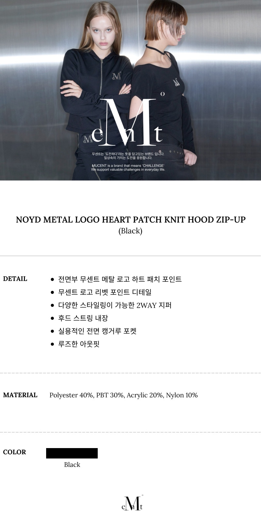 MUCENT Noyd Metal Logo Heart Patch Knit Hood Zip-up Black