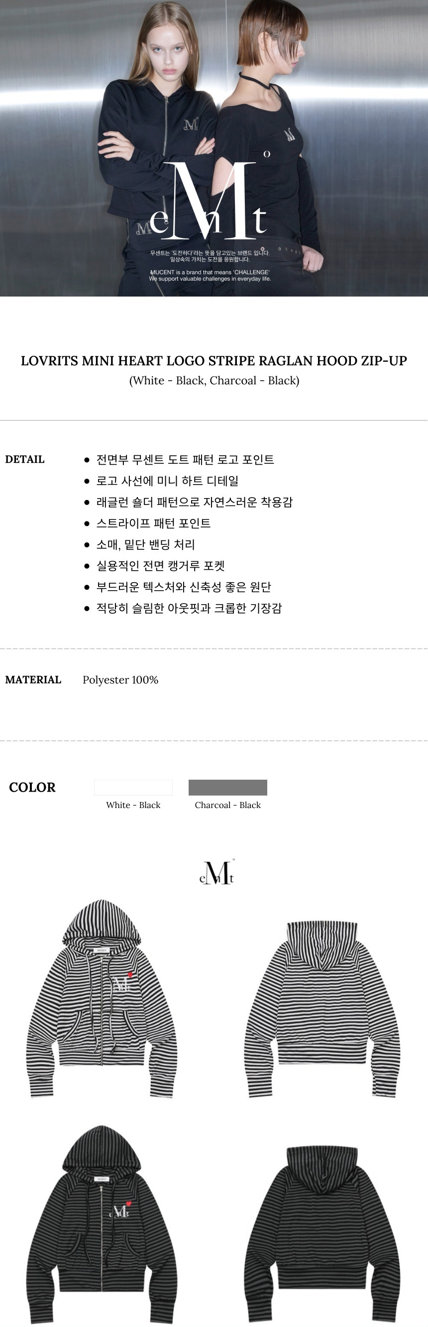 MUCENT Lovrits Mini Heart Logo Stripe Raglan Hood Zip-up (2Color) Charcoal - Black