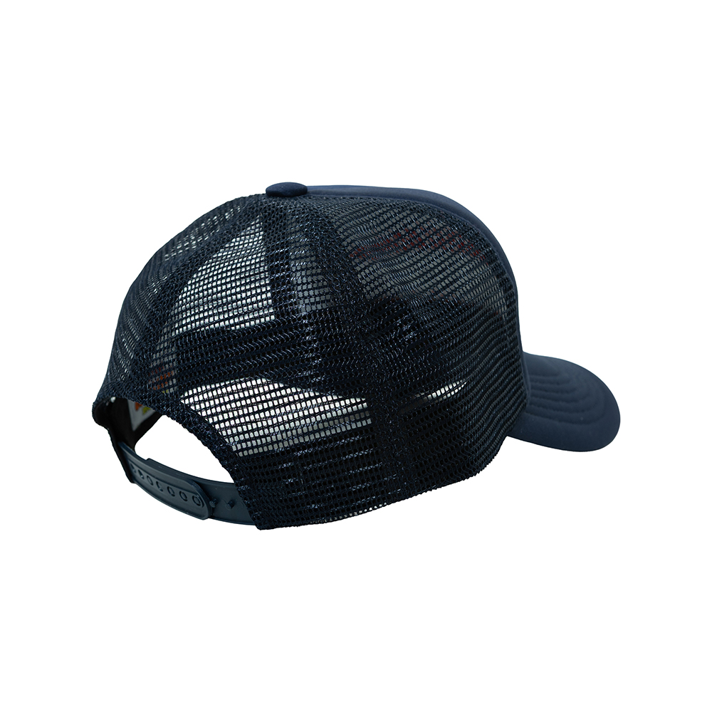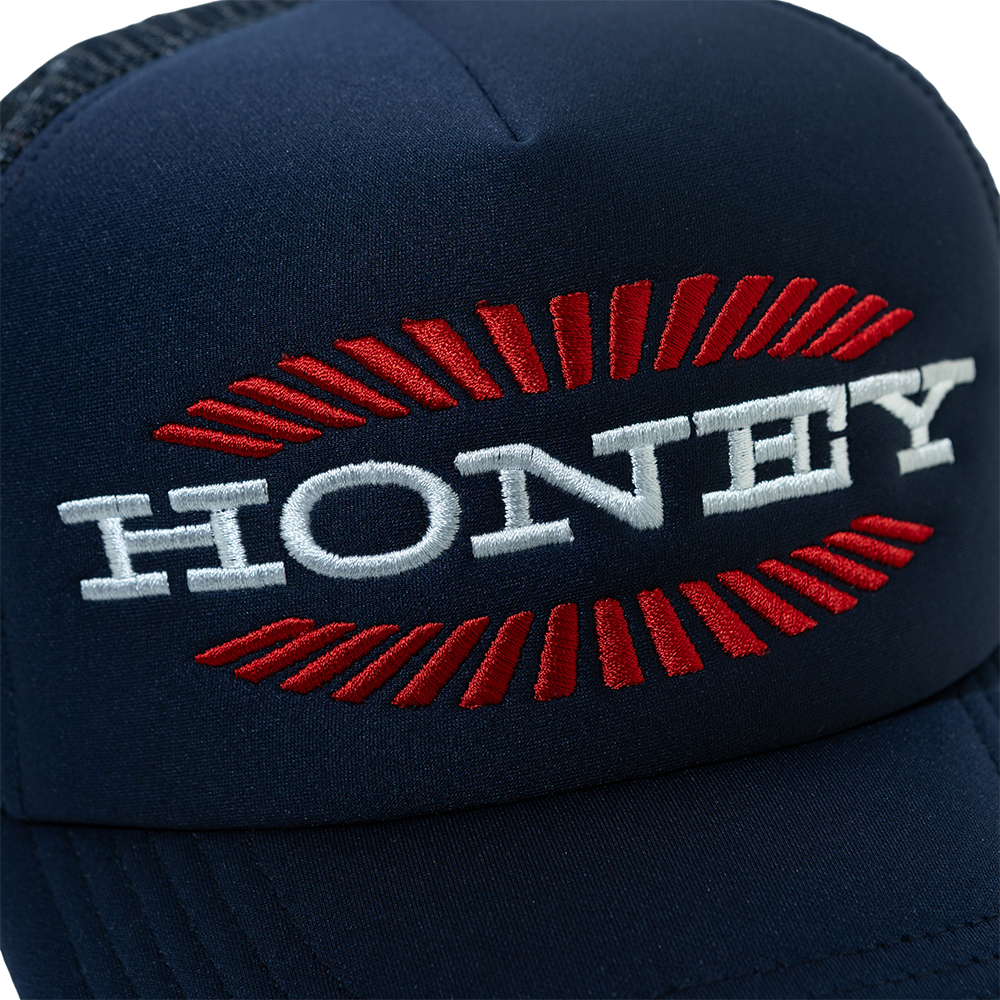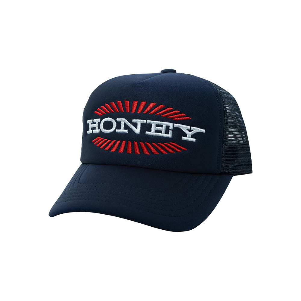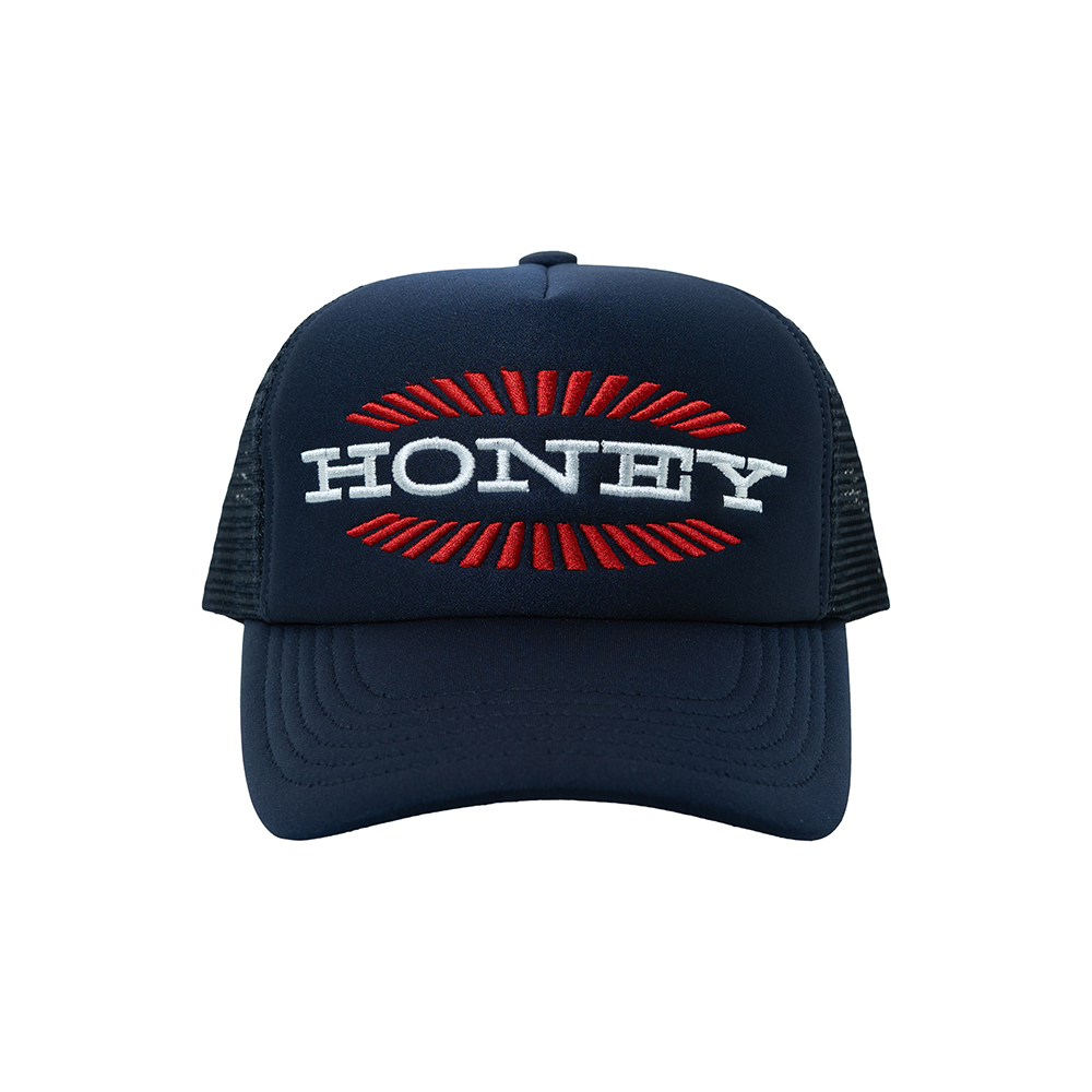 HONEY SCOOP HOUSE BURST LOGO TRUCKER CAP NAVY 100% COTTON / MESH: 95% POLYESTER, 5% POLYURETHANE BREATHABLE MESH ADJUSTABLE FIT SNAPBACK CLOSURE