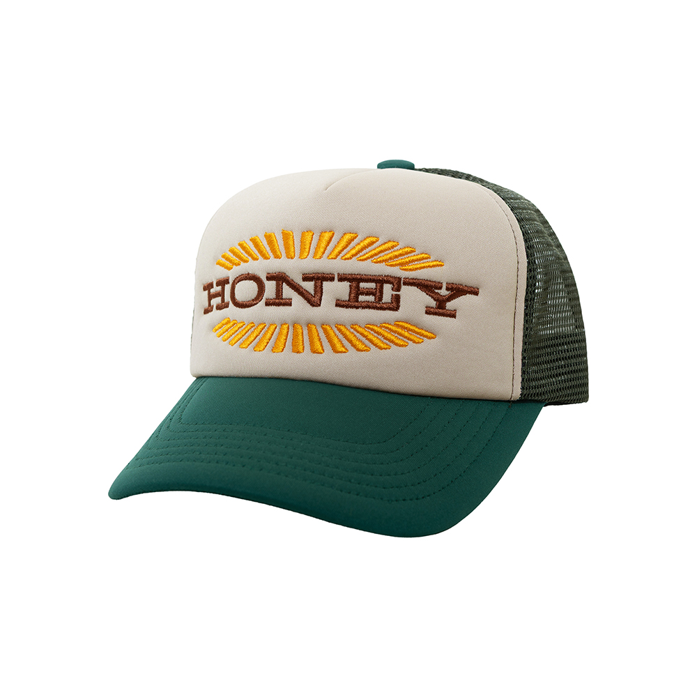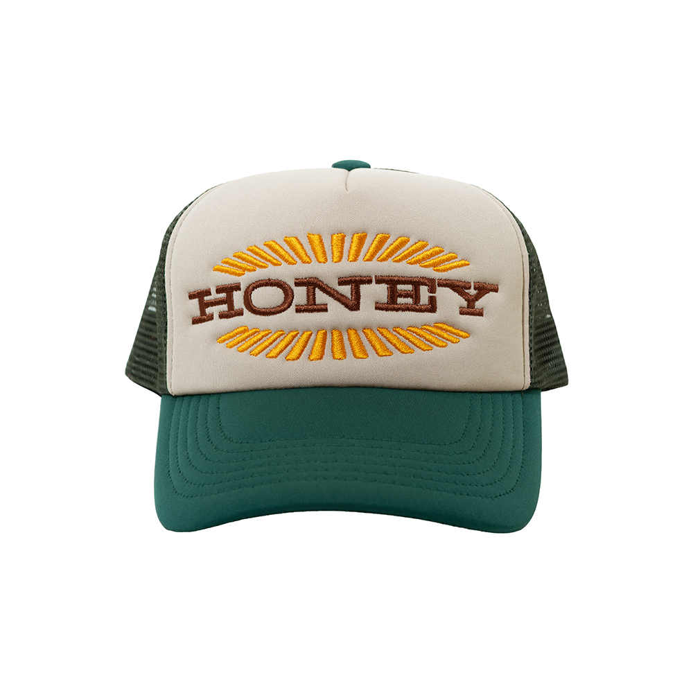 HONEY SCOOP HOUSE HNY LOGO TRUCKER CAP DEEP GREEN 100% COTTON / MESH: 95% POLYESTER, 5% POLYURETHANE BREATHABLE MESH ADJUSTABLE FIT SNAPBACK CLOSURE