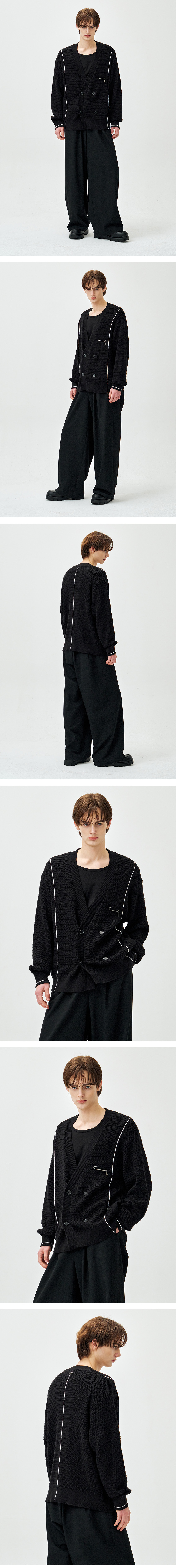 - 셈블런스 더블브레스트 가디건 상품 - 입체감 있게 직조된 면사와 핸들자수 라인배색 디테일이 어울러진 가디건 제품 - 더블 브레스트 실루엣 - 적당한 기장감으로 가볍게 걸치기 좋은 니트 아우터 - 탈부착이 가능한 셈블런스 고스트 심볼 금속 핀 장식