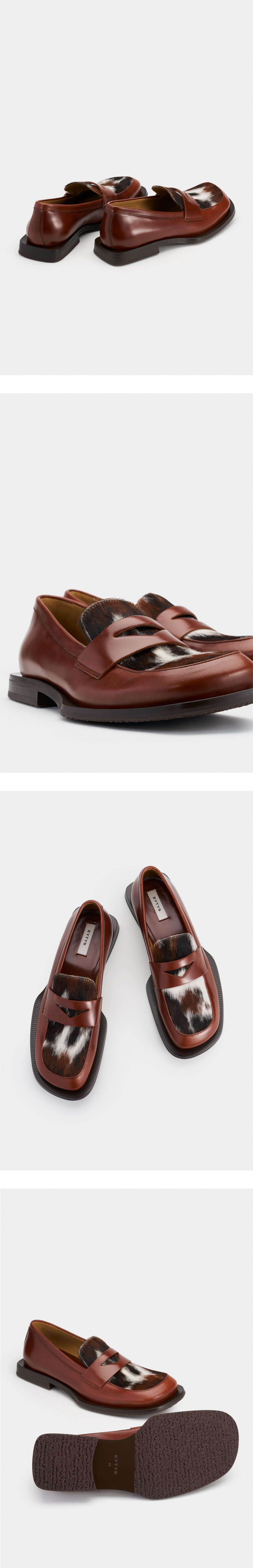 이티스 사반트 마호가니 카프 헤어 레더 브라운입니다. - 광택감이 있는 폴리시드 레더와 송아지 털 소재의 조합 - 아이비리그 스타일을 재해석한 유니크한 비대칭 앞코 디자인 - 유연함과 접지력을 모두 갖춘 핸드크래프트 고무창 적용 - 라텍스와 가죽 커버 인솔로 편안하고 풍부한 쿠셔닝 제공 - 2cm 굽 높이와 안정적인 스퀘어 힐 디테일 - 천연 소재 특성상 제품마다 패턴이 다른 고유의 희소성 - MADE IN PORTUGAL