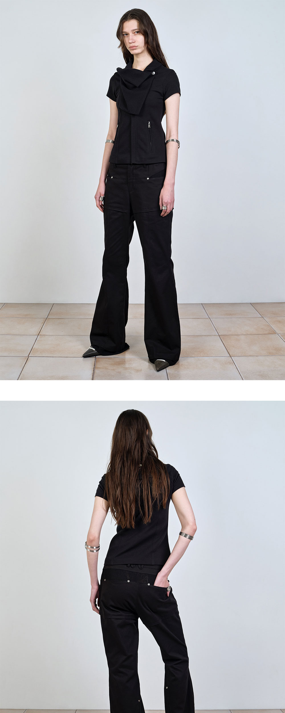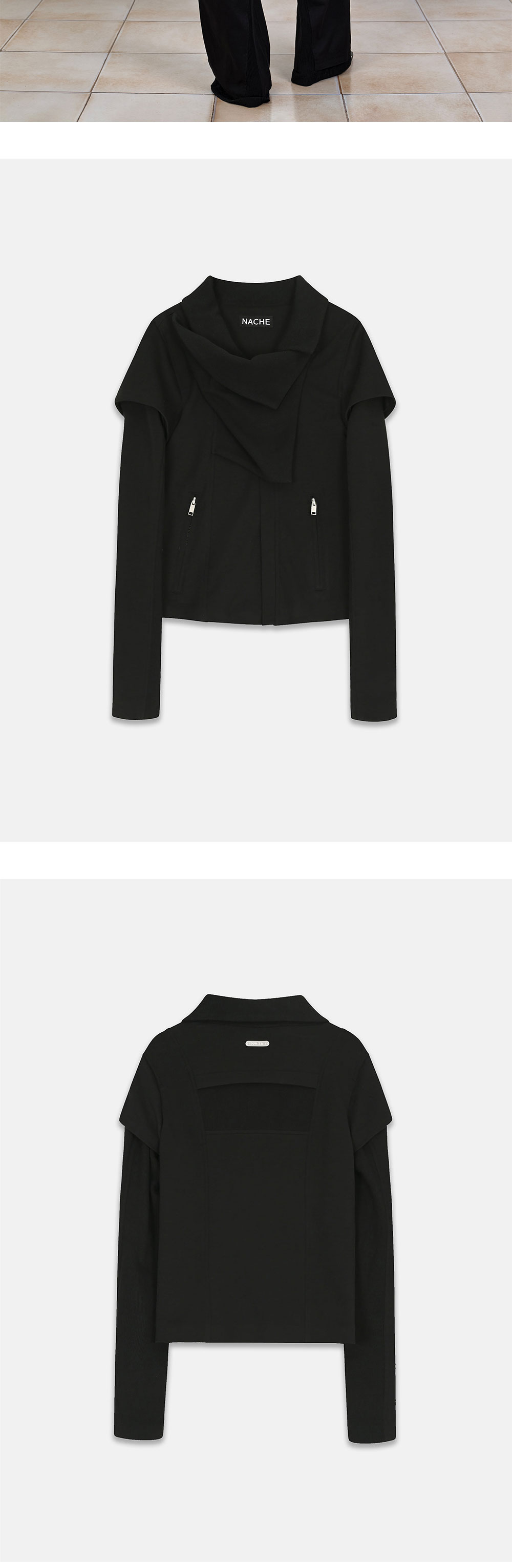 나체 우먼 투웨이 슬림 코튼 라이더 자켓 블랙입니다. - 슬림 핏 라이더 자켓 - 탄탄한 싱글, 골지 코튼 패브릭 믹스매치 - 프론트 드레이핑 실루엣 - 탈부착 가능한 2-WAY 슬리브 - 시그니처 로고 스냅 디테일 *모델 스펙: 177cm S Size 착용