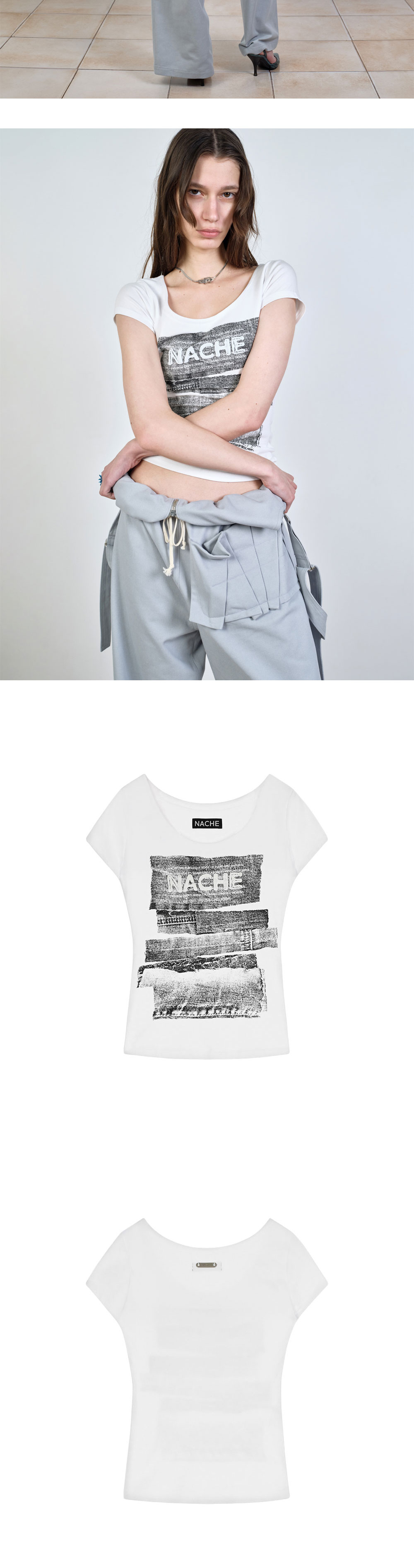 나체 우먼 콜라주 로고 프린티드 티셔츠 아이보리입니다. - 데님 텍스처를 활용한 빈티지 나체 로고 그래픽 - 깊은 라운드 넥과 슬림핏으로 페미닌한 라인 강조 - 부드러운 코튼 혼방 소재의 편안하고 자연스러운 핏 - 아방가르드한 무드를 데일리하게 풀어낸 포인트 아이템 *모델 스펙: 177cm S Size 착용