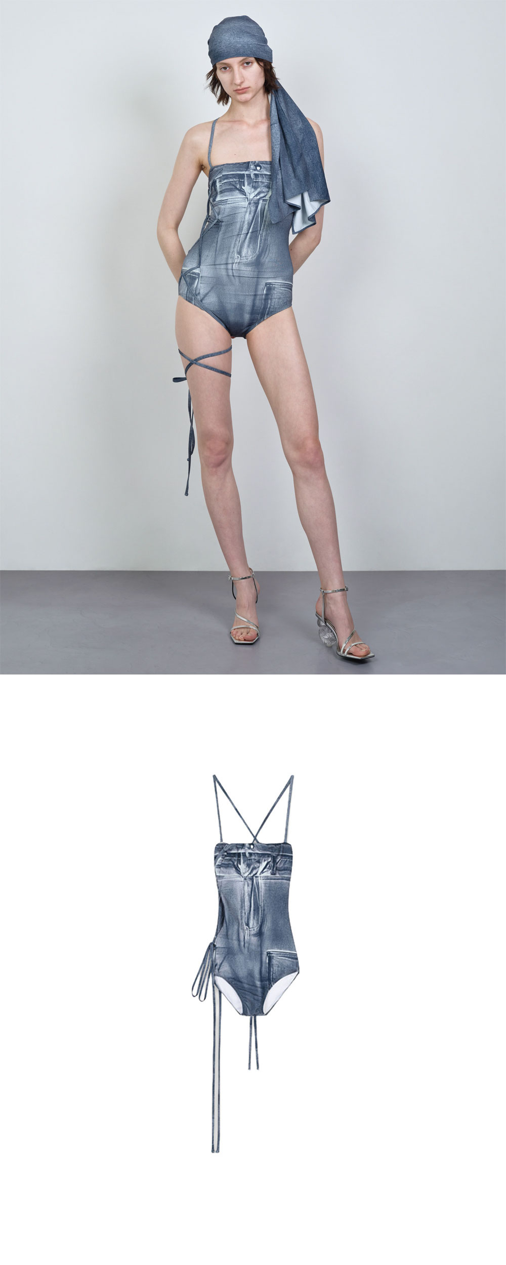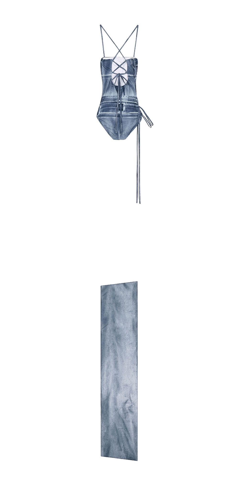 나체 우먼 데님 프린티드 스윔수트 블루 입니다. - 고해상도 데님 텍스처 프린팅의 신축성 있는 소재 - 슬림한 숄더 스트랩으로 가벼운 어깨 라인 연출 - 측면 롱 스트랩 타이 디테일 포인트