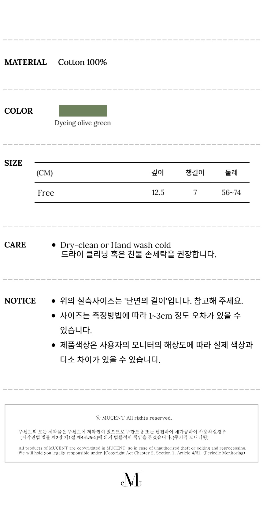 ┃Detail 볼캡에 로고를 넣을 때 무센트의 지향성과 세리프체와 잘 어울려서 폰트를 세 리프체로 채택했습니다. 세리프는 로마글 활자의 기둥의 양 끝을 맺는 돌출된 형태로 과거 로마 황제의 기념비에 새겨진 글자 모양을 다듬어 만든 고전적인 글자꼴에 기본을 두고 있습니다. 이 볼캡은 남녀공용으로 모두 착용할 수 있게 제작하려 했기 때문에 적당 한 깊이여야 했습니다. 우리의 볼캡은 깊이감이 깊습니다. 푹 들어가는 깊이 감 덕분에 눌러썼을 때의 모자 핏감, 그리고 적당히 긴 챙으로 얼굴이 작아보 이는 모자 핏이 무센트 볼캡만의 특징입니다. ┃Material : Cotton 100% ┃Care : Dry Cleaning - 무센트는 말기의 행성인 이 지구에서 지속가능한 옷들을 고민합니다. 우리는 신념을 소비하는 미닝아웃을 지지합니다.