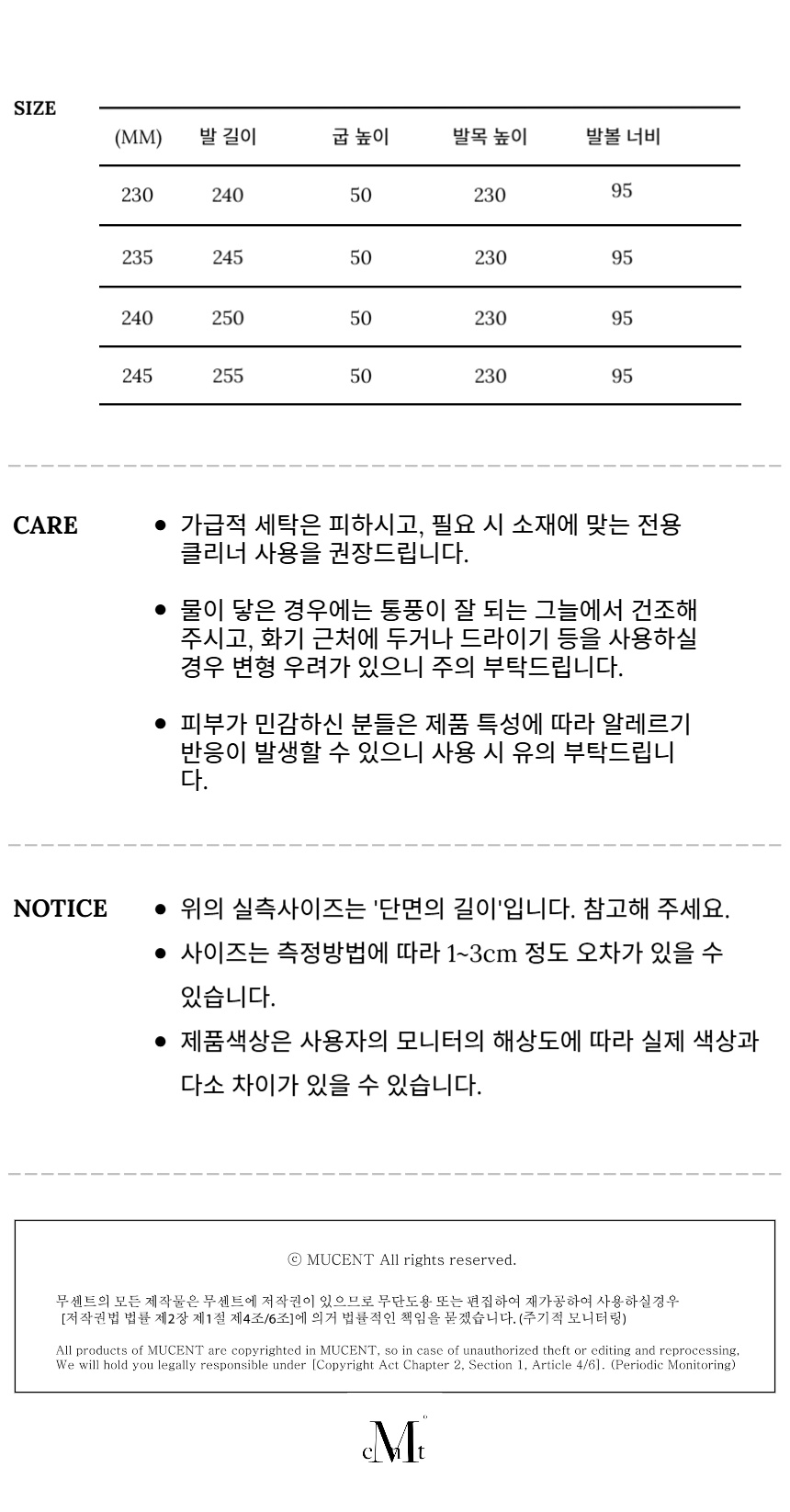 ┃Detail • 전면부 무센트 시그니처 로고 고무 패치 포인트 • 5cm의 굽 높이로 키높이 효과 • 접지력이 극대화 되도록 설계된 굴곡의 아웃솔로 미끄럼 방지 • 내부 쿠션으로 오래 신어도 편안한 착화감 • 뒤꿈치 백혼 디테일로 신고 벗기가 편안함 • 다양한 코디와 자연스럽게 매치 가능한 코디 아이템 ┃Material : PVC 100% ┃Care : Dry cleaning - 무센트는 말기의 행성인 이 지구에서 지속 가능한 옷들을 고민합니다. 우리는 신념을 소비하는 미닝아웃을 지지합니다.
