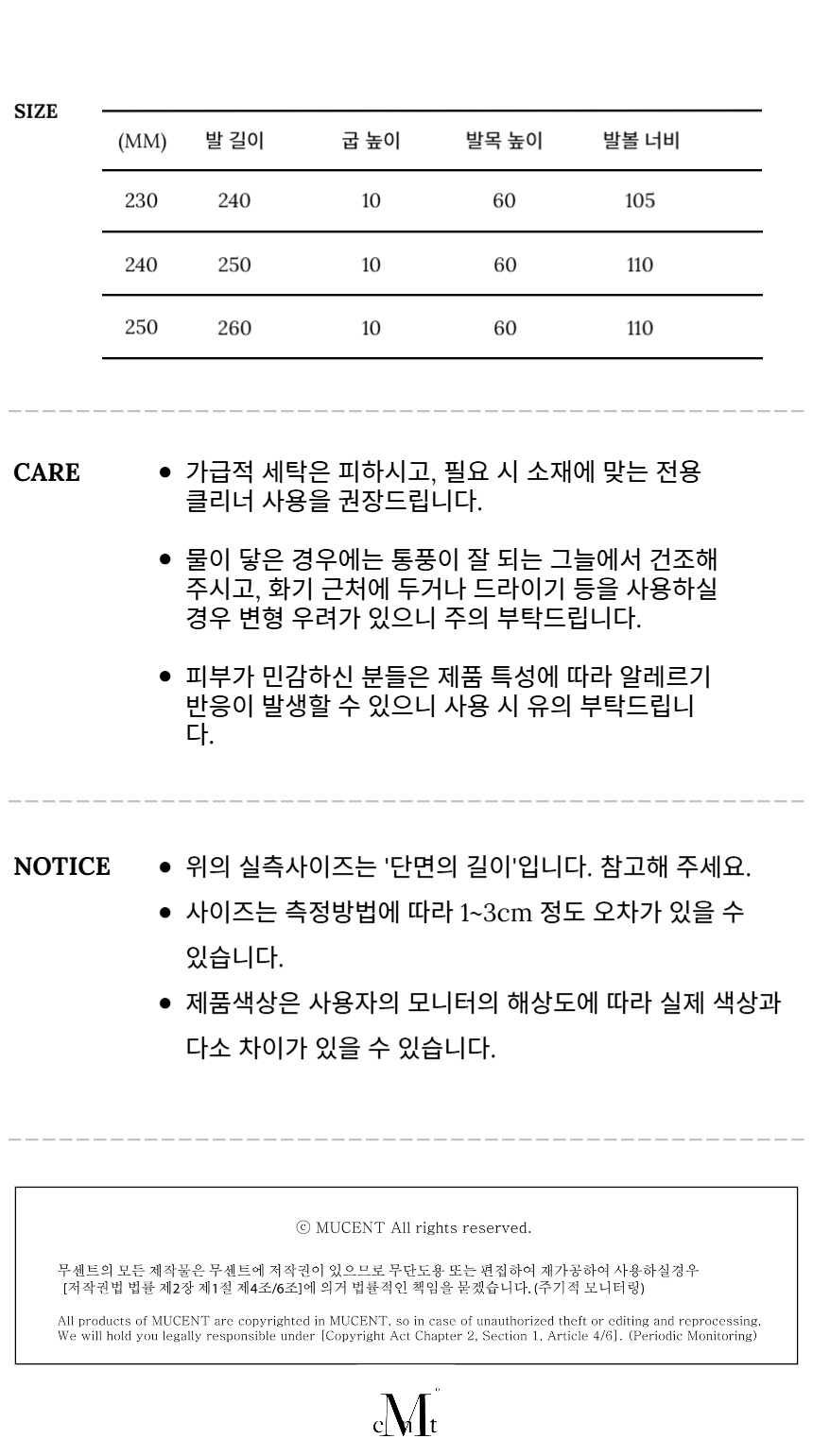 | 발 길이 | 굽 높이 | 발목 높이 | 발볼 너비 |