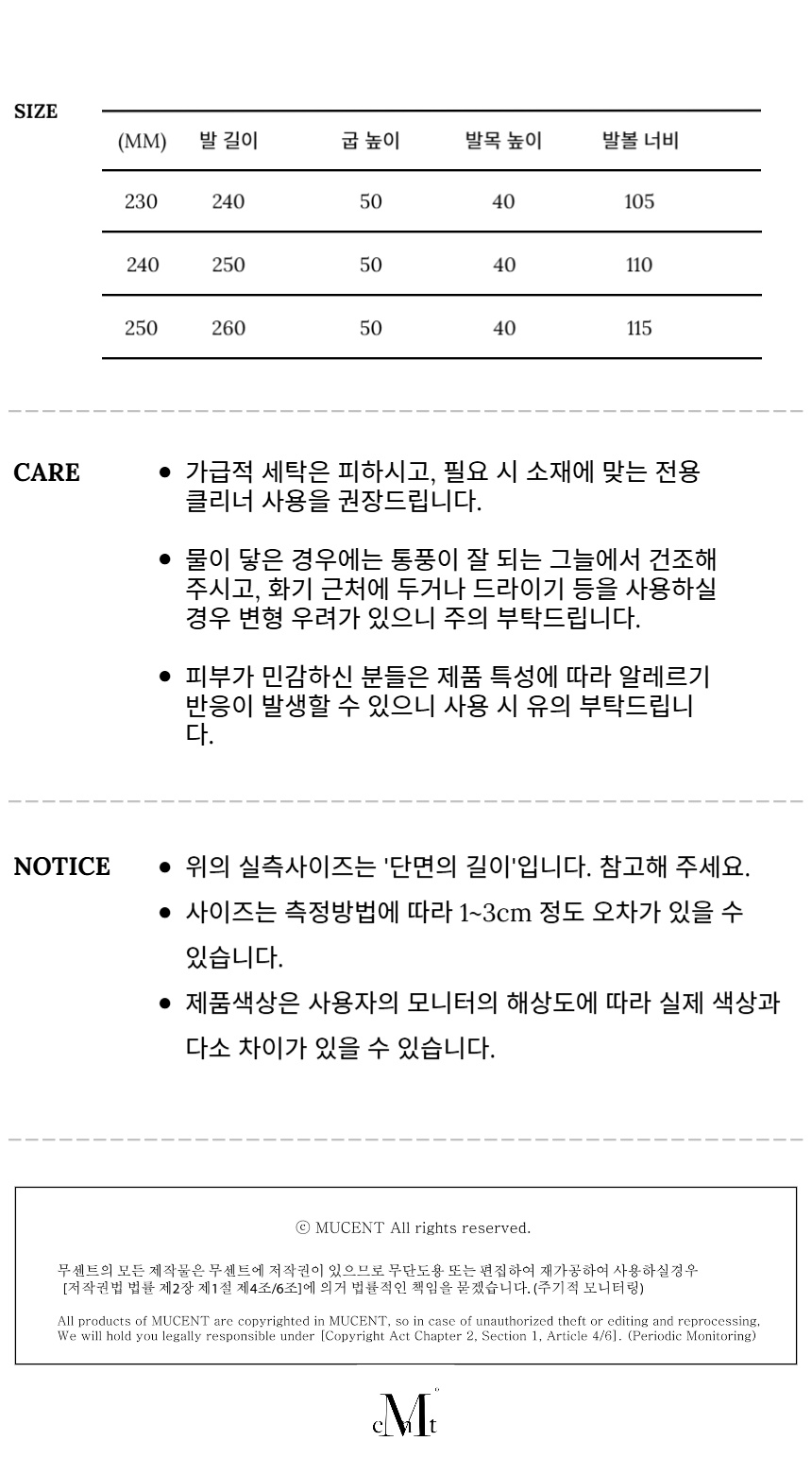 ┃Detail • 앞코 부분 무센트 입체 금속 메탈 로고 포인트 • 버클 스트랩으로 사이즈를 맞게 조절 가능 • 라운드한 앞코로 귀여운 포인트 • 푹신한 쿠션감으로 편안한 착화감 • 5cm의 굽 높이로 키 높이 효과 • 다양한 코디와 매치하기 좋은 아이템 ┃Material : Upper : Polyester 100% Lining : PVC 100% ┃Care : 상세페이지 참조 - 무센트는 말기의 행성인 이 지구에서 지속 가능한 옷들을 고민합니다. 우리는 신념을 소비하는 미닝아웃을 지지합니다.