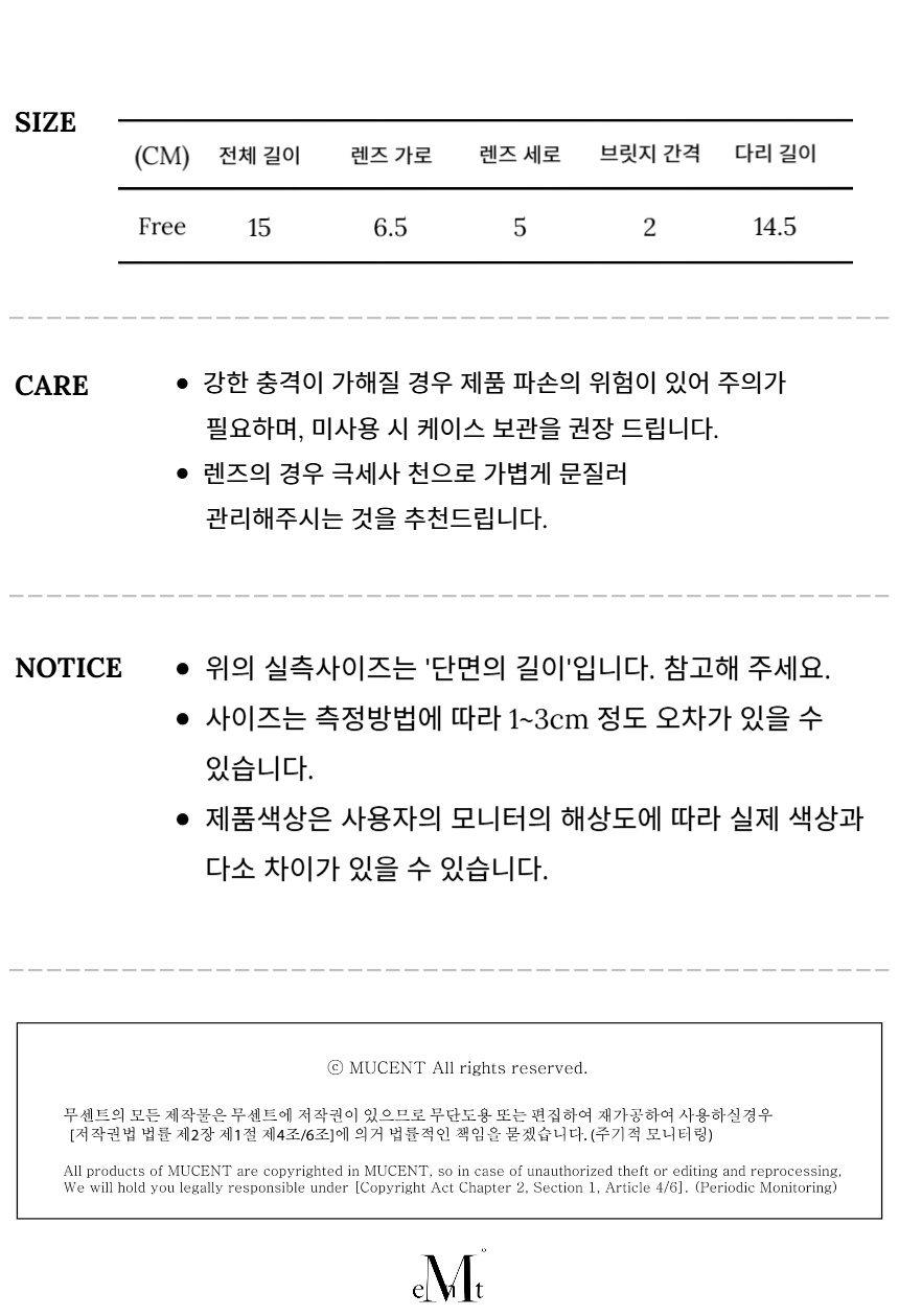 ┃Detail • 사이드 무센트 시그니처 로고 포인트 • 프레임에 정밀하게 맞춰 가공된 렌즈가 삽입된 디자인 • 노즈 패드로 편안함 착용감 • 열에 강하여 변색이 잘 되지 않는 아세테이트 소재 • UV 자외선차단 렌즈 적용으로 자외선으로부터 안구 보호 • 안경집 및 안경닦이 증정 • 얼굴형에 관계없이 착용하기 좋은 데일리 아이템 ┃Material : Frame - Acetate 100%, Lens - UV400 ┃Care : 상세페이지 하단 참조 - 무센트는 말기의 행성인 이 지구에서 지속 가능한 옷들을 고민합니다. 우리는 신념을 소비하는 미닝아웃을 지지합니다.