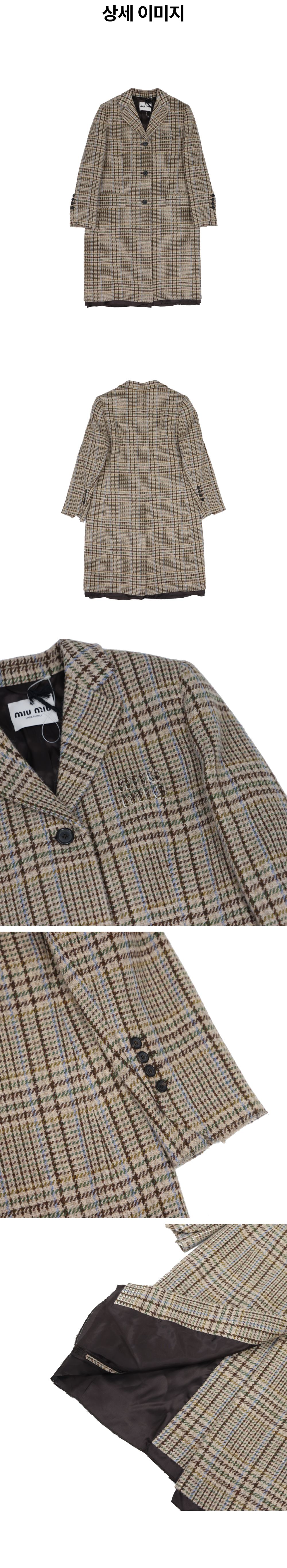 미우미우 MS1925 체스트 로고 싱글 브레스티드 플래드 체크 코트 울 카카오