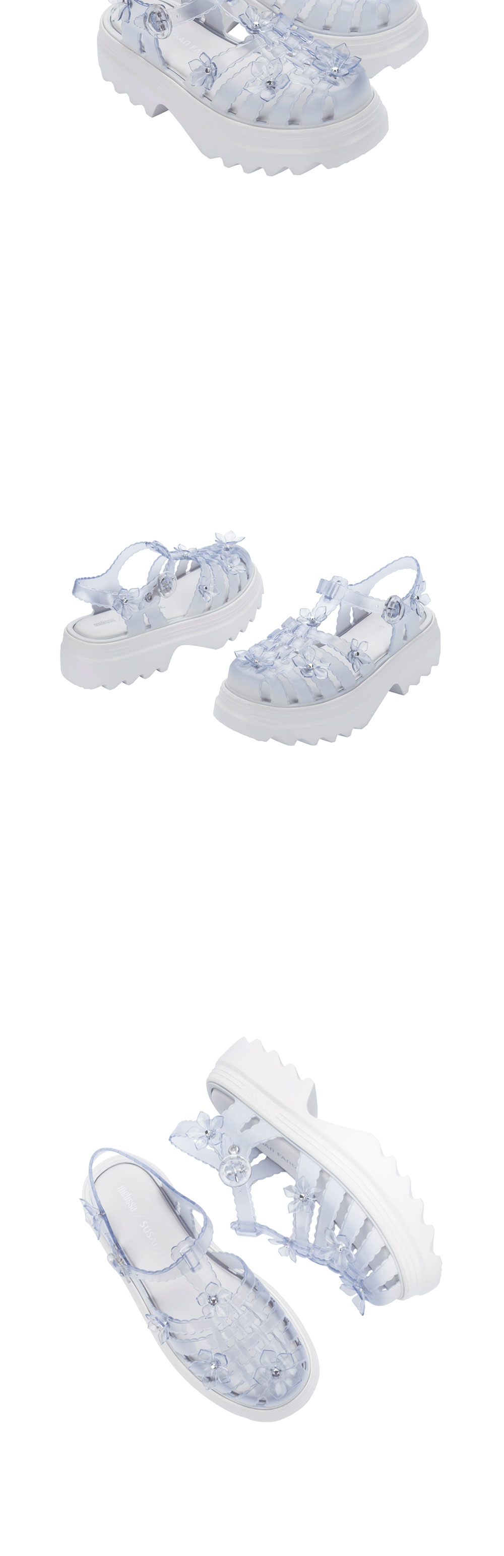 멜리사 x 수잔 팡 우먼 사쿠라 포제션 플랫폼 화이트 클리어 입니다. - 수잔 팡의 시그니처 플라워 패턴이 적용된 투명 젤리 슈즈 - 구름 위를 걷는 것 같은 느낌을 주는 멜리사만의 특별함 - 안정적인 착화감을 돕는 발등 벨크로 스트랩 - 멜리사 특유의 유연하고 향기로운 Melflex 소재 사용