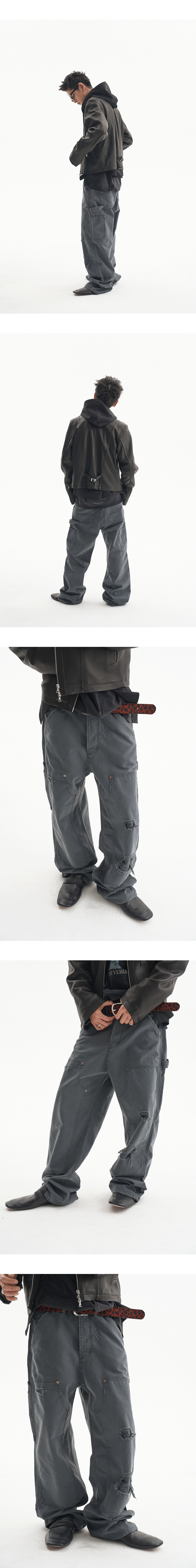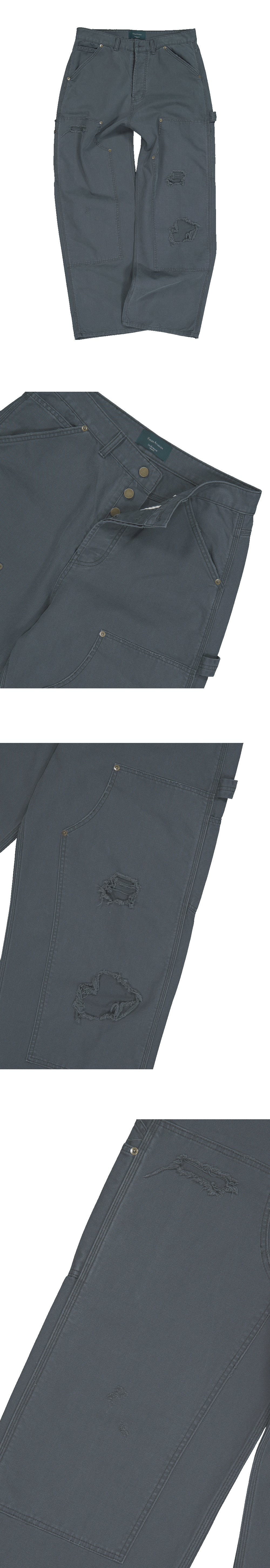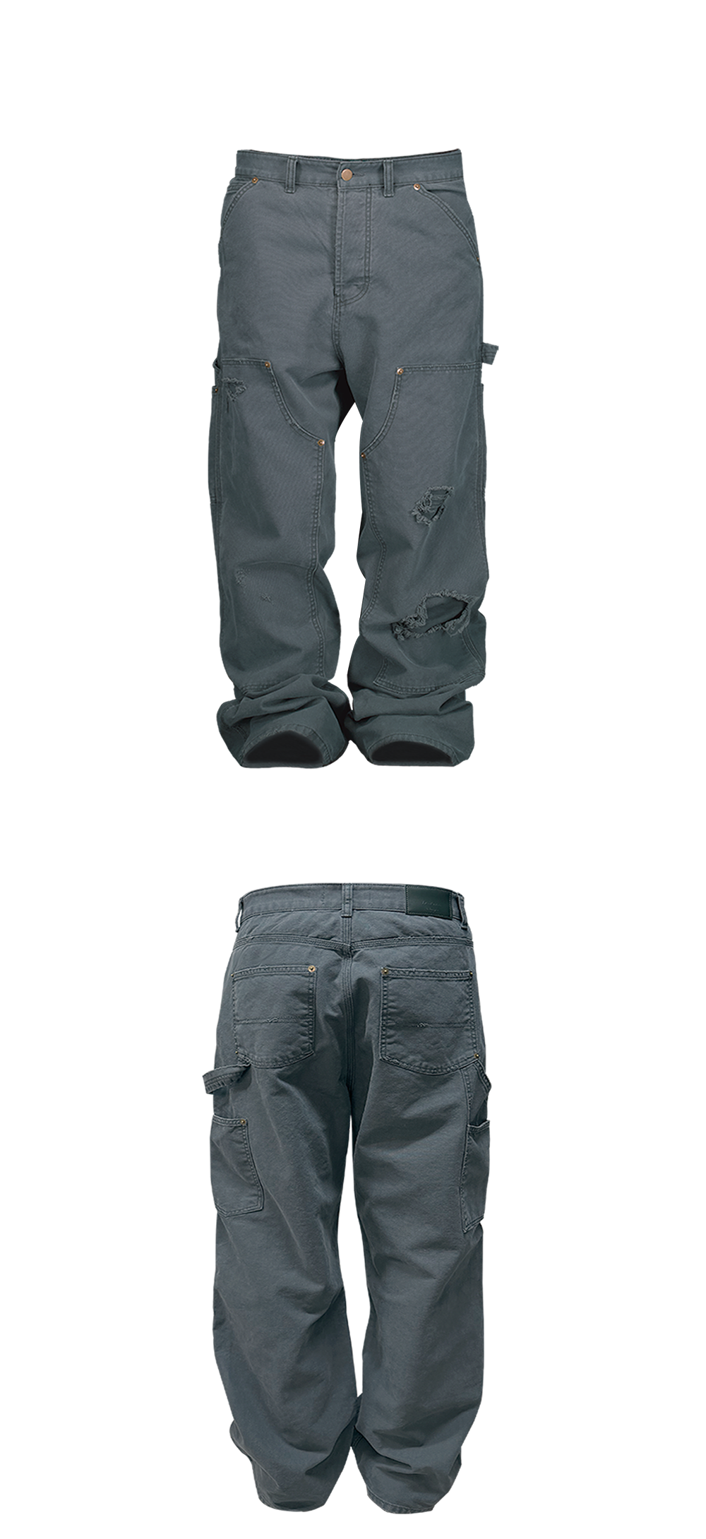 밀도 높은 캔버스를 강한 워싱으로 가공해 빈티지한 느낌을 살린 미드나잇 틸 색상의 더블니 워크 팬츠입니다. MODEL : 180CM / 61KG WEARING SIZE : 0