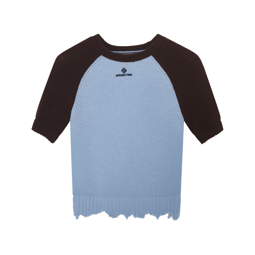 Shushu/Tong Women Color Block Raw Edge Short Sleeve Knit Top Blue - 26SS