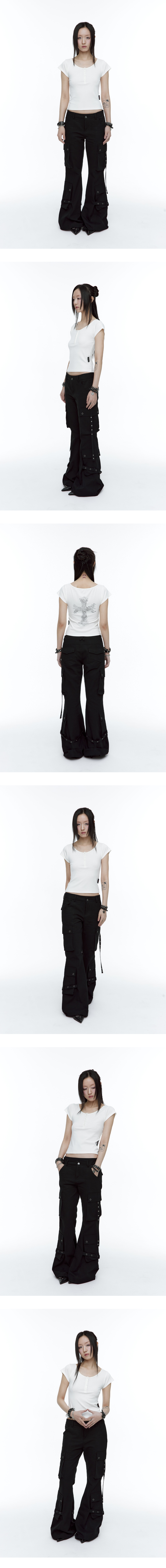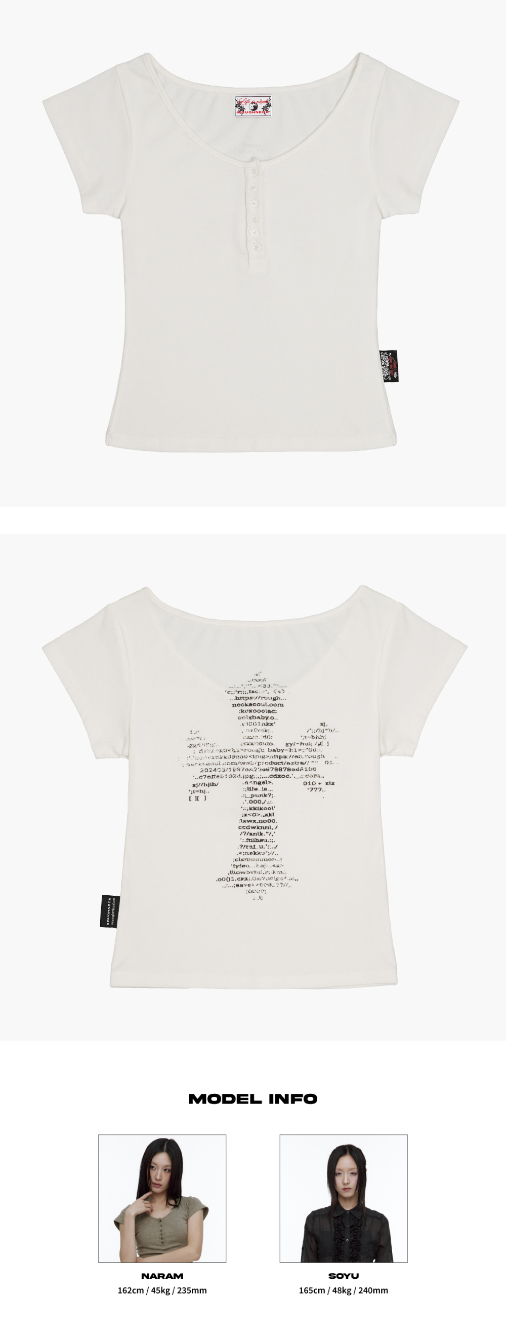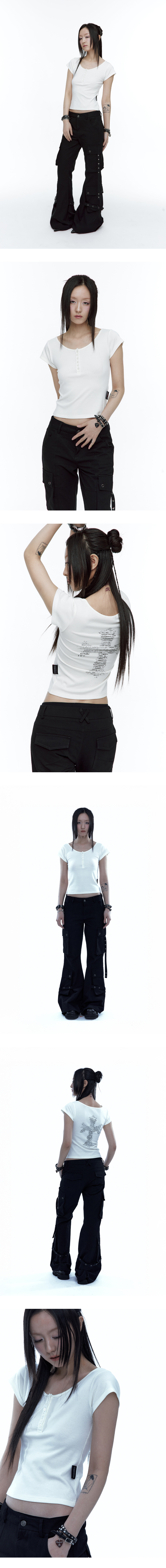 부드럽게 밀착되는 슬림한 실루엣의 숏 슬리브 톱입니다. 버튼 디테일이 더해진 헨리넥 디자인으로 단독 착용은 물론 이너로도 활용하기 좋습니다. 가볍고 부드러운 소재가 바디 라인을 따라 자연스럽게 떨어져 전체적으로 슬림한 인상을 완성합니다. 뒷면에는 그래픽 십자가 프린트를 더해 은은한 포인트를 더했습니다. - 비침정도 : ■ □ □ □ □ - 스판정도 : ■ ■ ■ ■ ■ - Rayon 38.8% Acrylic 27.3% Cotton 27.2% Span 6.7% - Model Info : NARAM (162cm / 45kg), SOYU (165cm / 48kg) - Fitting size : S