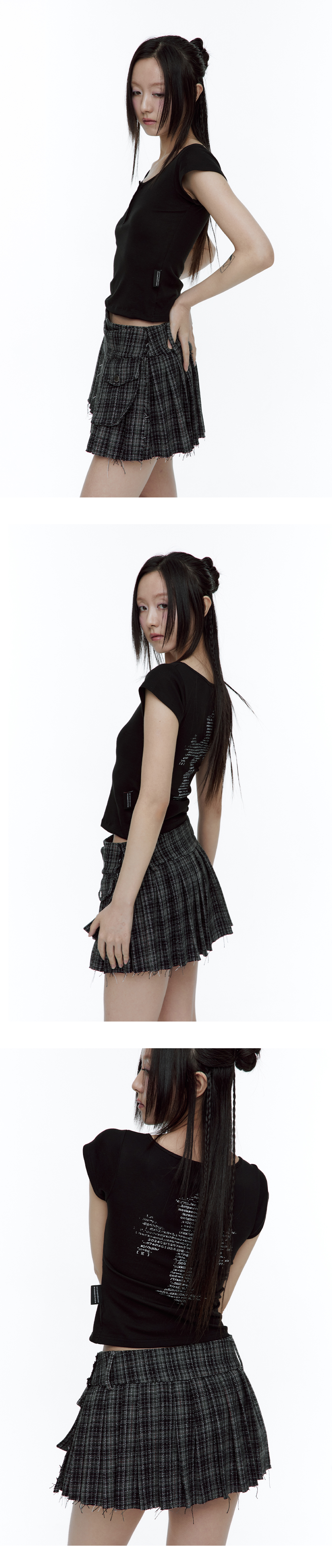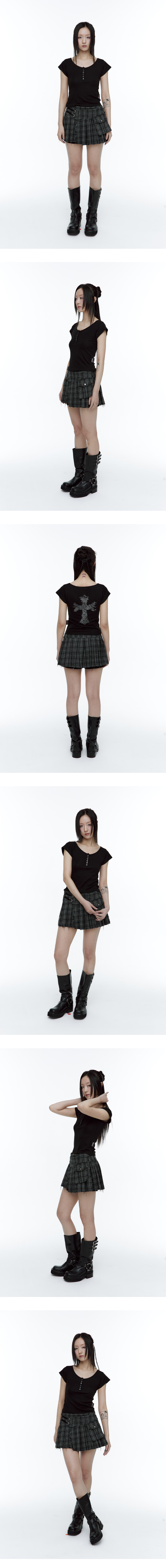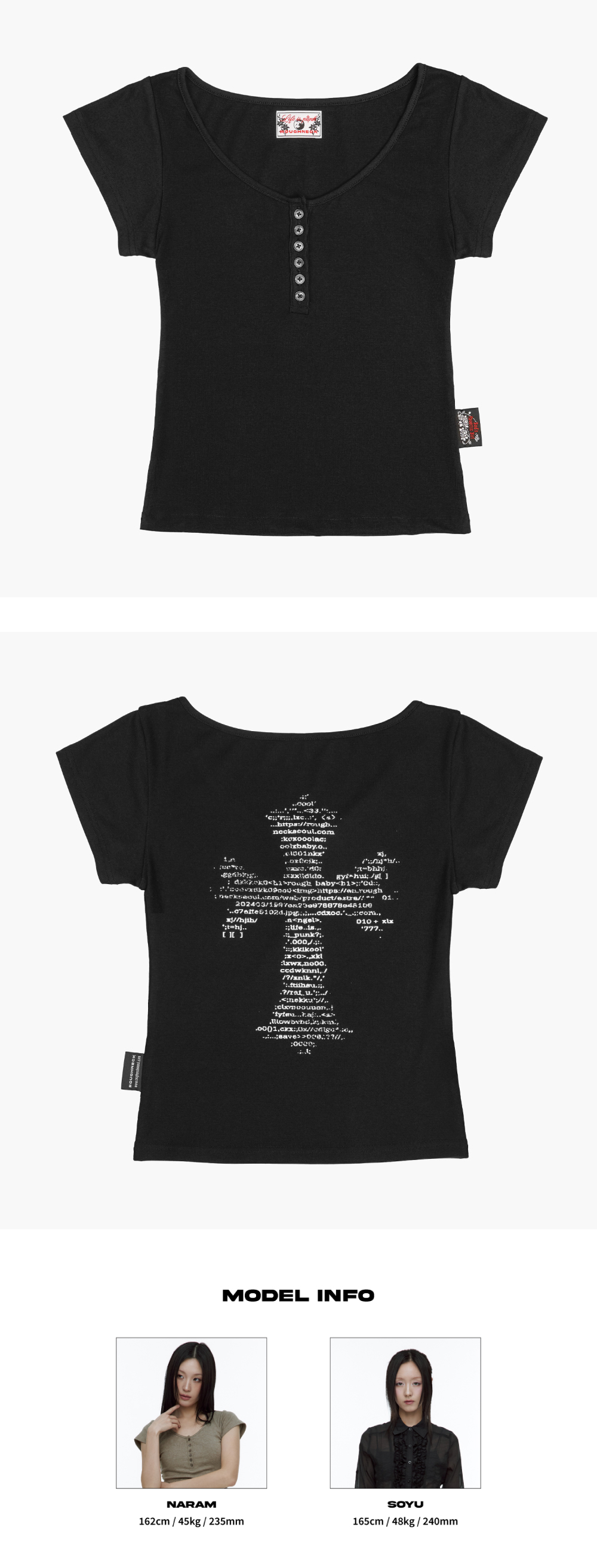부드럽게 밀착되는 슬림한 실루엣의 숏 슬리브 톱입니다. 버튼 디테일이 더해진 헨리넥 디자인으로 단독 착용은 물론 이너로도 활용하기 좋습니다. 가볍고 부드러운 소재가 바디 라인을 따라 자연스럽게 떨어져 전체적으로 슬림한 인상을 완성합니다. 뒷면에는 그래픽 십자가 프린트를 더해 은은한 포인트를 더했습니다. - 비침정도 : □ □ □ □ □ - 스판정도 : ■ ■ ■ ■ ■ - Rayon 38.8% Acrylic 27.3% Cotton 27.2% Span 6.7% - Model Info : NARAM (162cm / 45kg), SOYU (165cm / 48kg) - Fitting size : S
