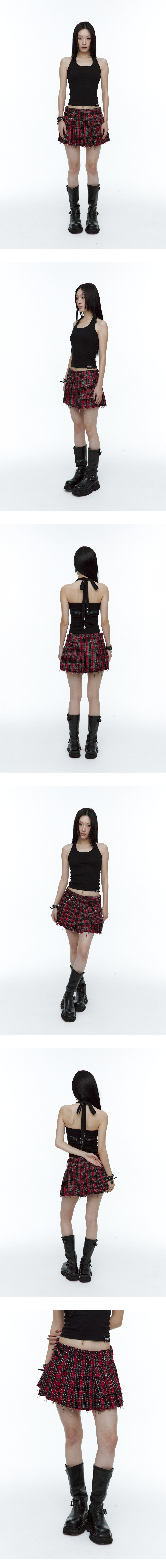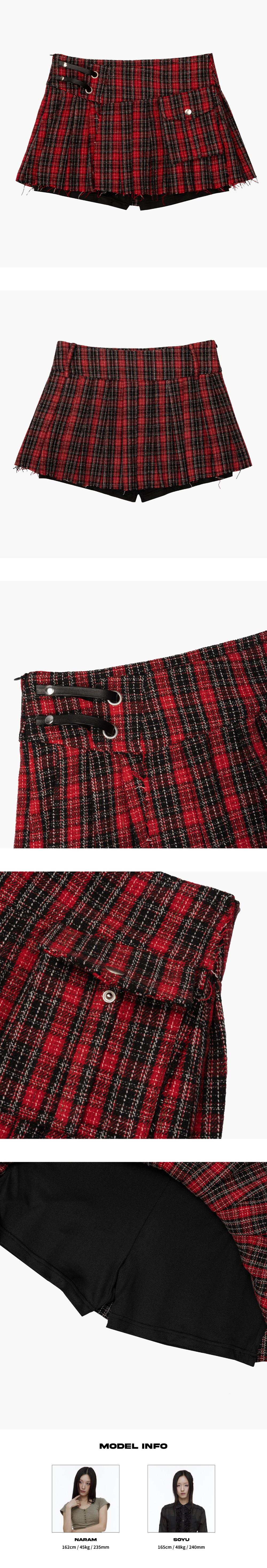 직조된 트위드 원단 특유의 입체적인 텍스처와 타탄 체크 패턴이 돋보이는 스커트입니다. 왼쪽 상단의 가죽 스트랩과 카고 포켓으로 디자인 포인트를 주었으며, 밑단의 컷오프 마감으로 내추럴한 디테일을 살렸습니다. 안감이 속바지 형태로 제작되어 편안하게 착용할 수 있습니다. - 비침정도 : □ □ □ □ □ - 스판정도 : □ □ □ □ □ - Polyester 100% - Model Info : NARAM (162cm / 45kg), SOYU (165cm / 48kg) - Fitting size : S